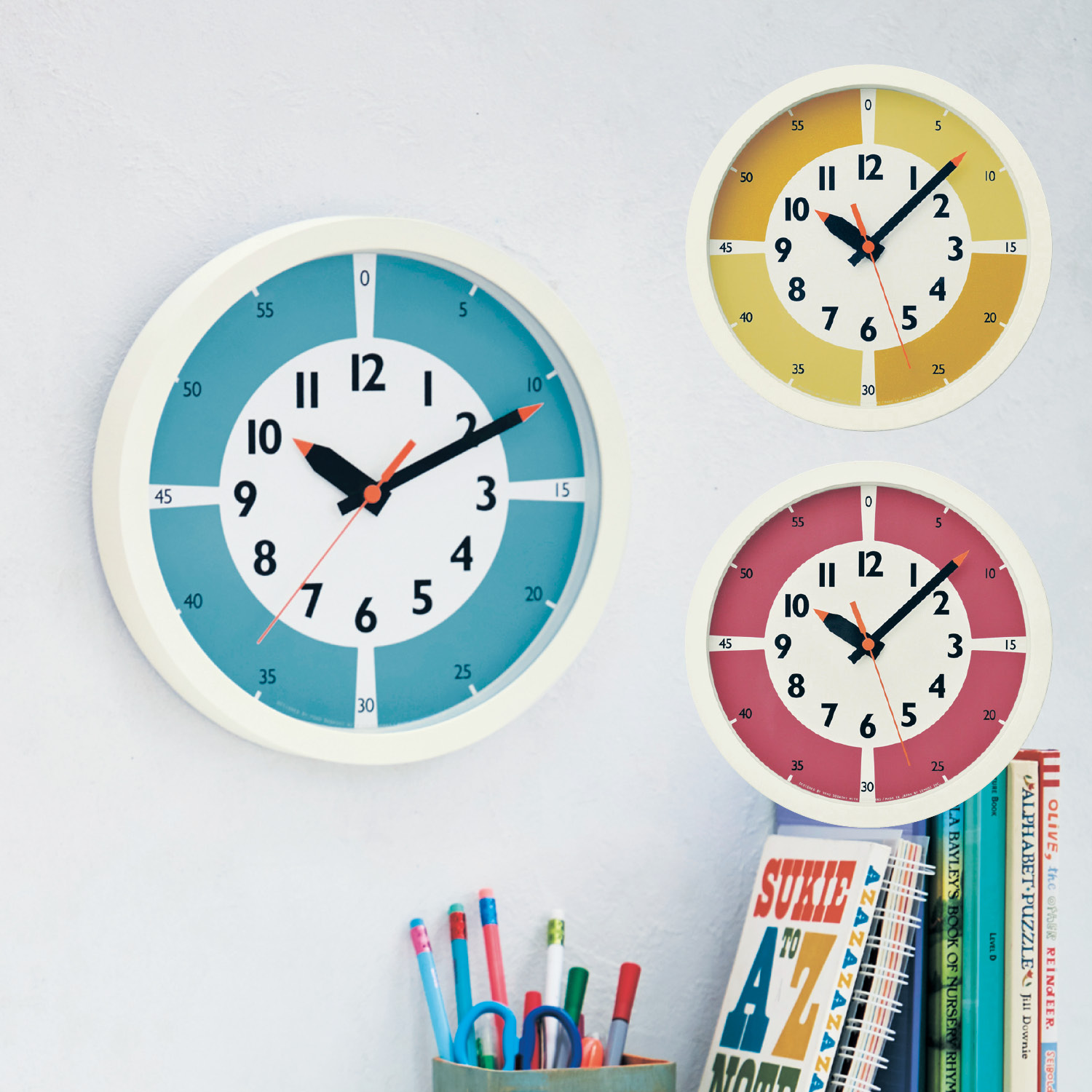 アナログ時計の持つ「円グラフ」の特徴を活かしながら、色を効果的に使い、1時間をおおらかに4分割して捉えることで、子ども自身でスケジュールを管理できるように導いてあげることを意図とした時計になります流れる時を視覚的に表わすスイープムーブメント『1コマ=15分』の区切りに白地を残す事で、気持ちを一度切り替え、白(地の色)になる心の余裕を促しています。インテリアペイントのメーカー・株式会社カラーワークス協力のもと、12種類の顔料をブレンドして作った同社の繊細な色合い1488色の中から選びぬいた4つの配色。シックなインテリアにもカジュアルで遊び心のあるインテリアにも馴染みます。