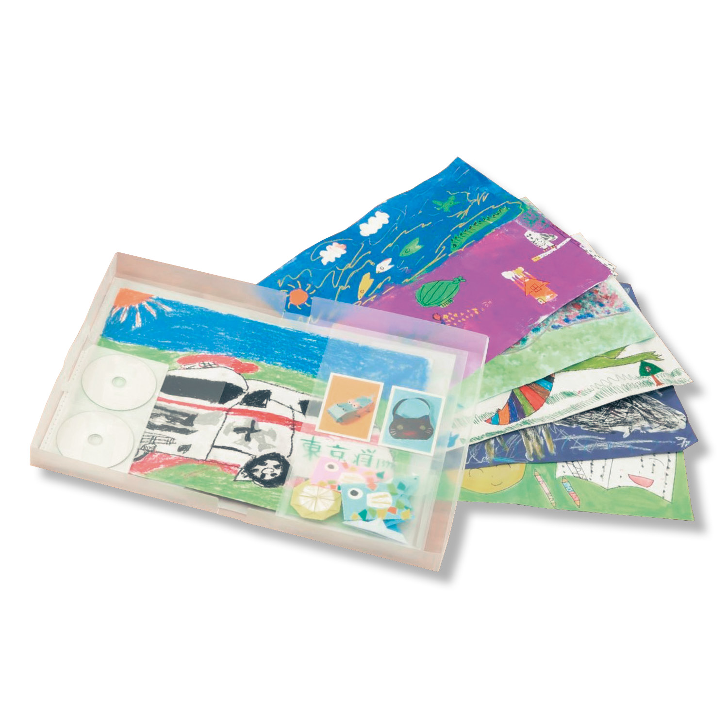 ―機能―・保管に困りがちな子どもの作品たちを大切に保管・作品の出し入れが簡単にできるポケット形状・両サイドにポケットがあり、ポケット開口が広く、上から出し入れがしやすいので厚口四ツ切り画用紙も収納可能・マチなしポケットは、写真やメモ入れに・マチありポケットには、やや厚みのある小物も収納可・CD・DVDも保存できるポケット付き・取っ手付きなので、棚からの取り出しやちょっとした持ち運びにも便利