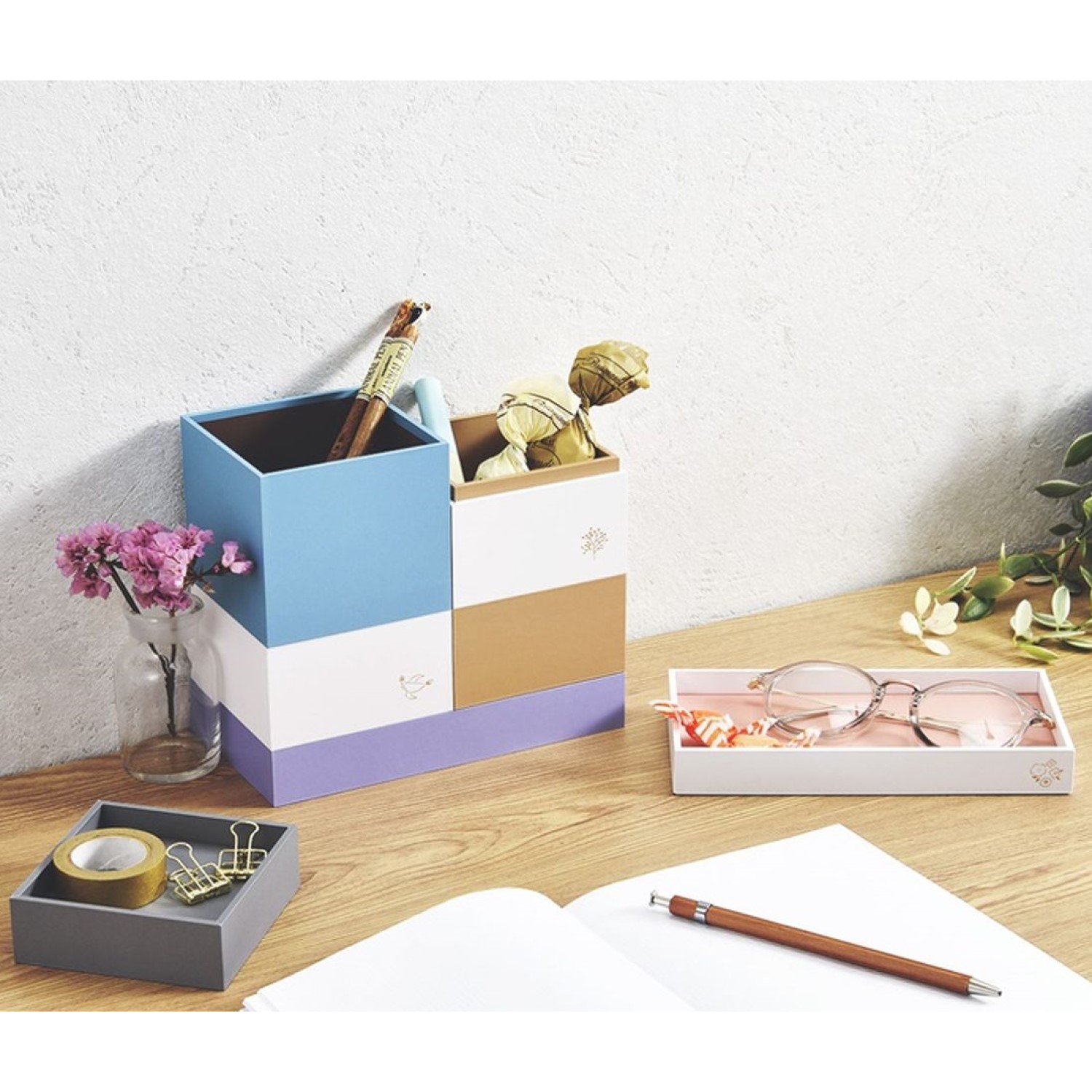 重ねて収納できる、環境に優しい紙素材の卓上小物入れです。ちょこんと置いてかわいいサイズ感。ペンや小物をまとめてスッキリと収納広く浅めのスタンドは、スティック糊や付箋、短いペンなども取り出しやすい設計です。リビング学習でもインテリアに馴染むデザイン木の学習机ともマッチします在宅スクやオフィスにも映える、マットな質感のくすみカラーを採用しました。同シリーズの製品を重ねて使うこともできます。※各シリーズ製品の最上段の上には、パーツを重ねることはできません。