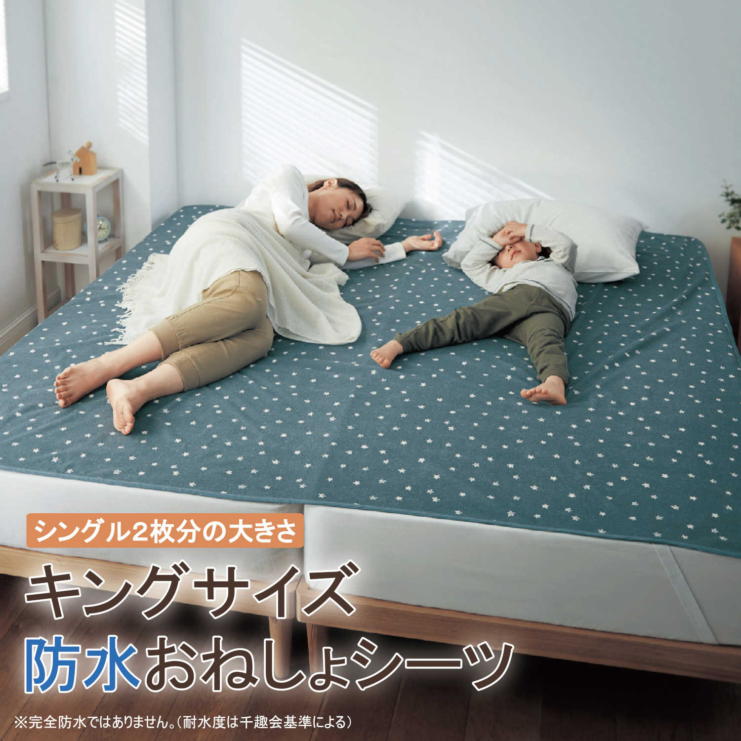 ―仕様―・大切な寝具を守る防水おねしょシーツ・シングル2枚分を全面カバーできるキングサイズ・眠っている間に動きまわっても広くカバーするから安心―素材―・裏面はラミネート加工でおねしょが布団に浸透するのを防止・表面はさらりと心地いい綿混パイル素材