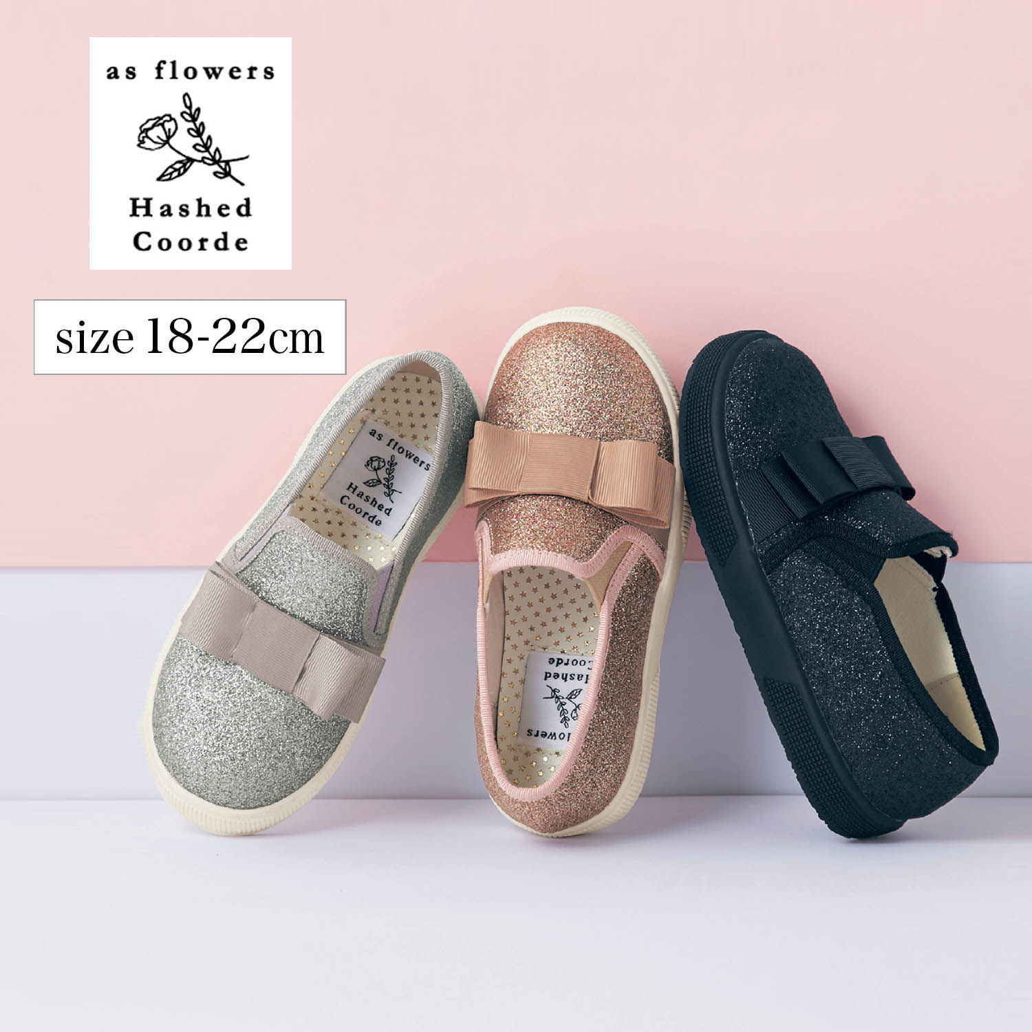 ーデザイン・スタイリングー・シンプルなデザインながらラメ使いがガーリー・大きめリボンもラブリーな一足・装いを選ばず合わせやすいのも魅力・普段にもお出かけにも活躍ー機能ー・スリッポンタイプなので脱ぎ履きスムーズ