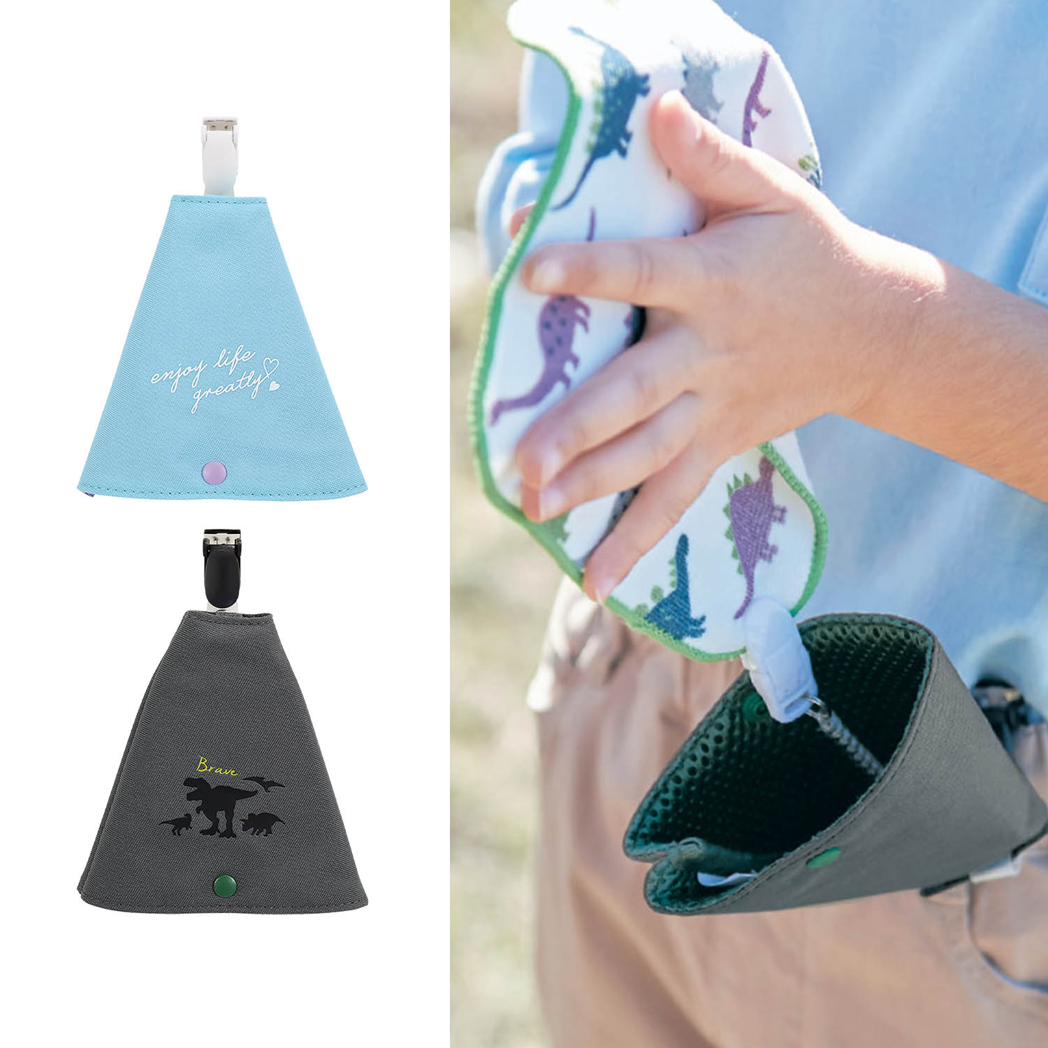 ―デザイン・仕様―・サッと拭けて、通気性バツグン!クリップ付きのハンカチホルダー・ハンカチを装着して、腰にクリップで留めることができます・コイルチェーンが伸びるので、ホルダーを腰につけたままハンカチで手や口を拭けます・使い終わったらそのままハンカチを広げておけば、乾きやすく衛生的・ハンカチが乾いたら、ホックで留めて中にしまえます―素材―・内側は通気性の良いメッシュ生地ー機能ー・学校でも安心お名前欄付き