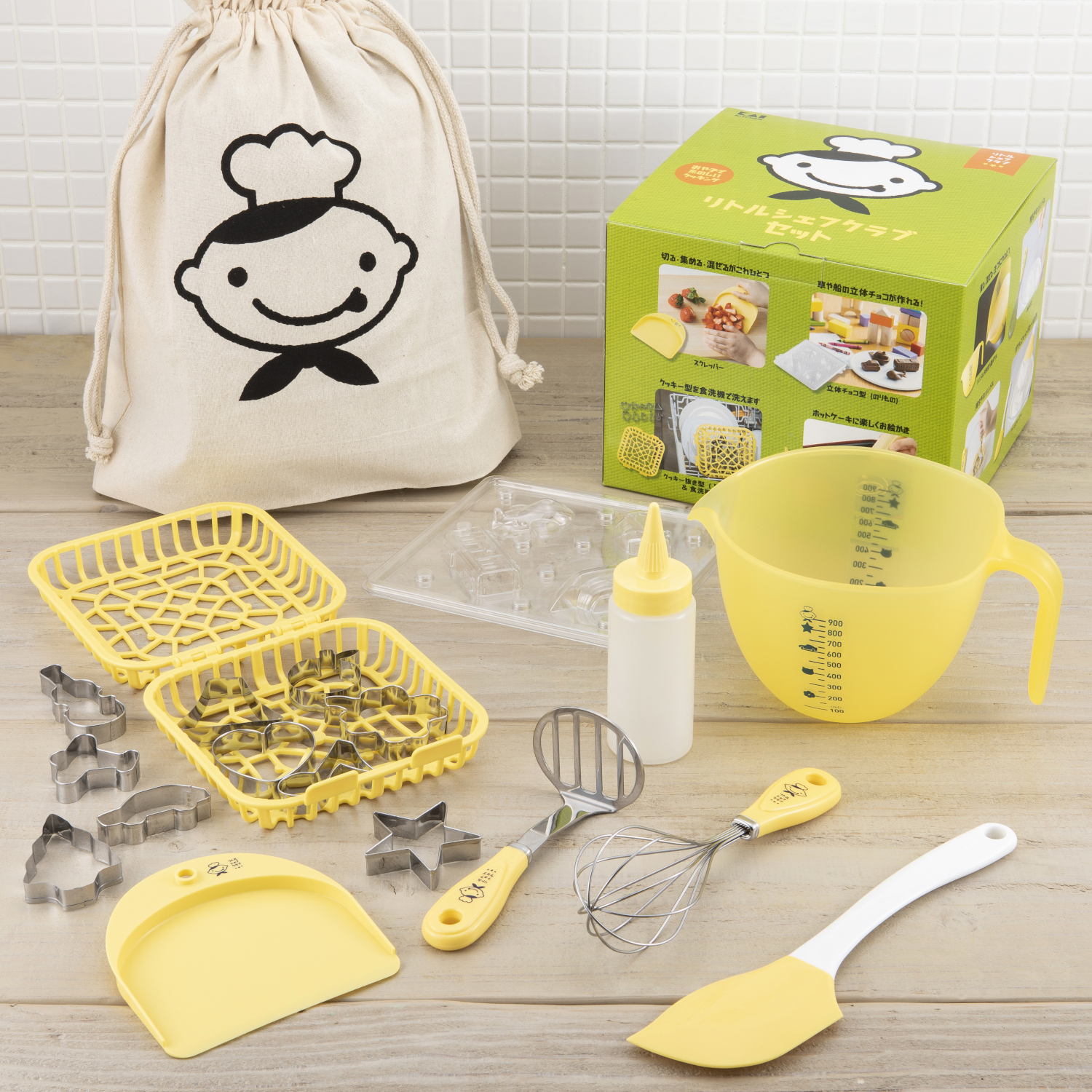 【セット内容】・あわだてこどもの手におさまるハンドルサイズ。手の力が伝わりやすい形状です。・マッシャーこどもの手におさまるハンドルサイズ。軽い力でバナナなどをつぶせます。・スクレッパー切る・集める・混ぜる、の作業がひとつででき、握りやすく手が痛くならないようフチ付きです。 クッキー生地のカスや粉の残りなどの片付けにも便利!・ケーキクリーナー握りやすく手の力が伝わりやすいハンドルと、ボウルの曲面にフィットするヘラ形状で、使いやすいサイズ感です。・ハンドル付き計量ボウルしっかり握れるハンドル付き。こどもにも分かりやすいよう目盛りごとにモチーフ付きで、親も指示がしやすい。・クッキー抜き型食洗機ケースセット(星・ハート)ケースに入れることで食洗機内の水圧でとばされずに洗うことができます。・おえかきホットケーキペンホットケーキの生地を中に入れてお絵かきしてから焼くと、焼き目の模様がつけられます。・立体チョコ型(のりもの)半分の面にチョコを流し入れ、両面を合わせて振ることで自立する立体のチョコレートが作れます。電車、飛行機、船、車の組み合わせです。・巾着袋セットアイテムをきれいに収納できる巾着袋です。