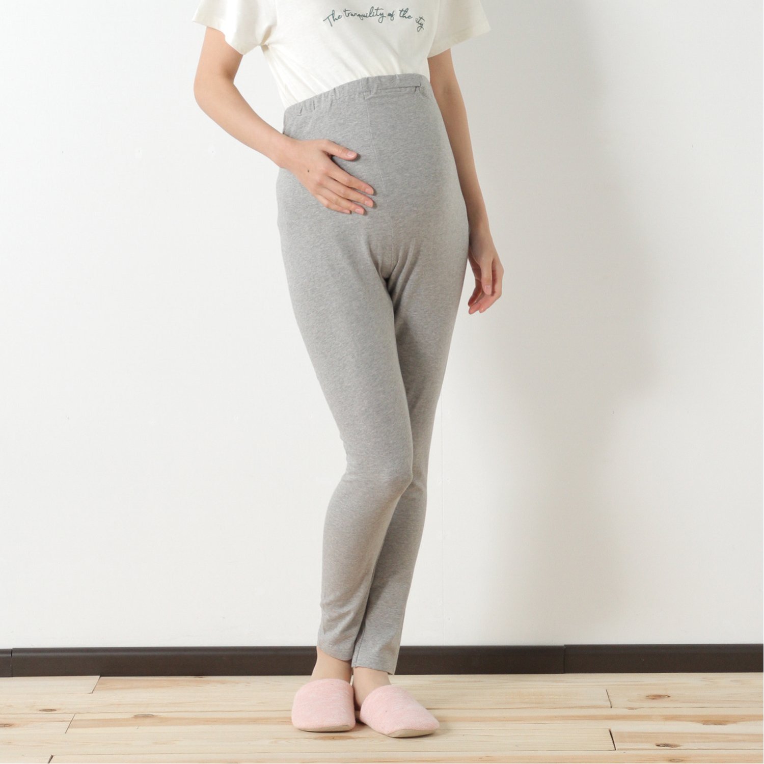 【おすすめのポイント】・他のアイテムとも合わせやすい細身のシルエット・お腹の変化に合わせて調節できるアジャスター付き・脇シームレスタイプでストレスフリーな着用感就寝時やリラックスタイムにおすすめのマタニティレギンス。綿を使用した肌触りの良い素材を使用しました。お腹の冷え対策にも◎。