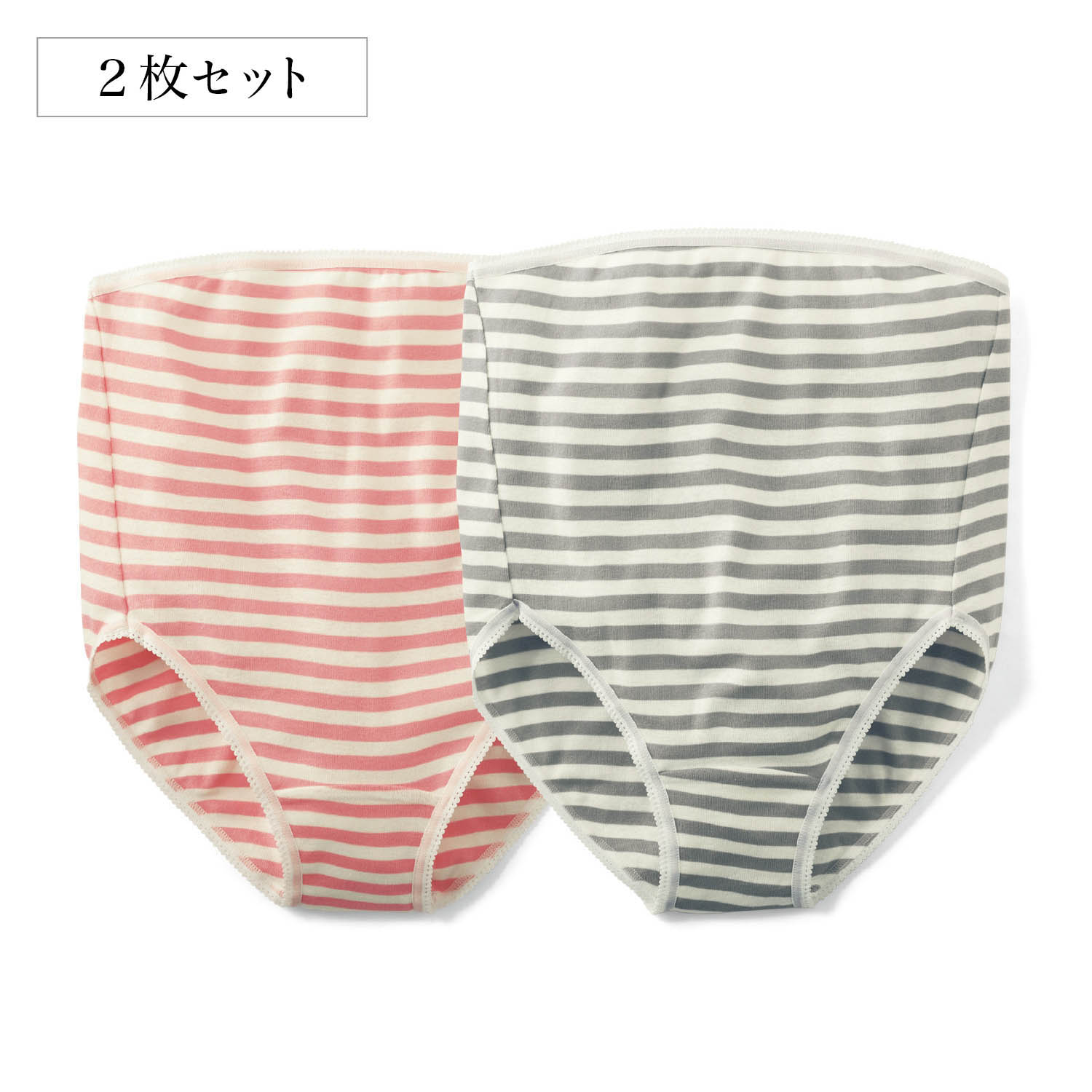 薄手で締め付け感のない綿100%素材ではき心地がよく、股上がしっかり深めでお腹をすっぽり包んでくれるマタニティショーツ。洗い替えにも便利な2枚セット。ウエストと足口は配色仕様同シリーズのハーフトップとペアでつけられます