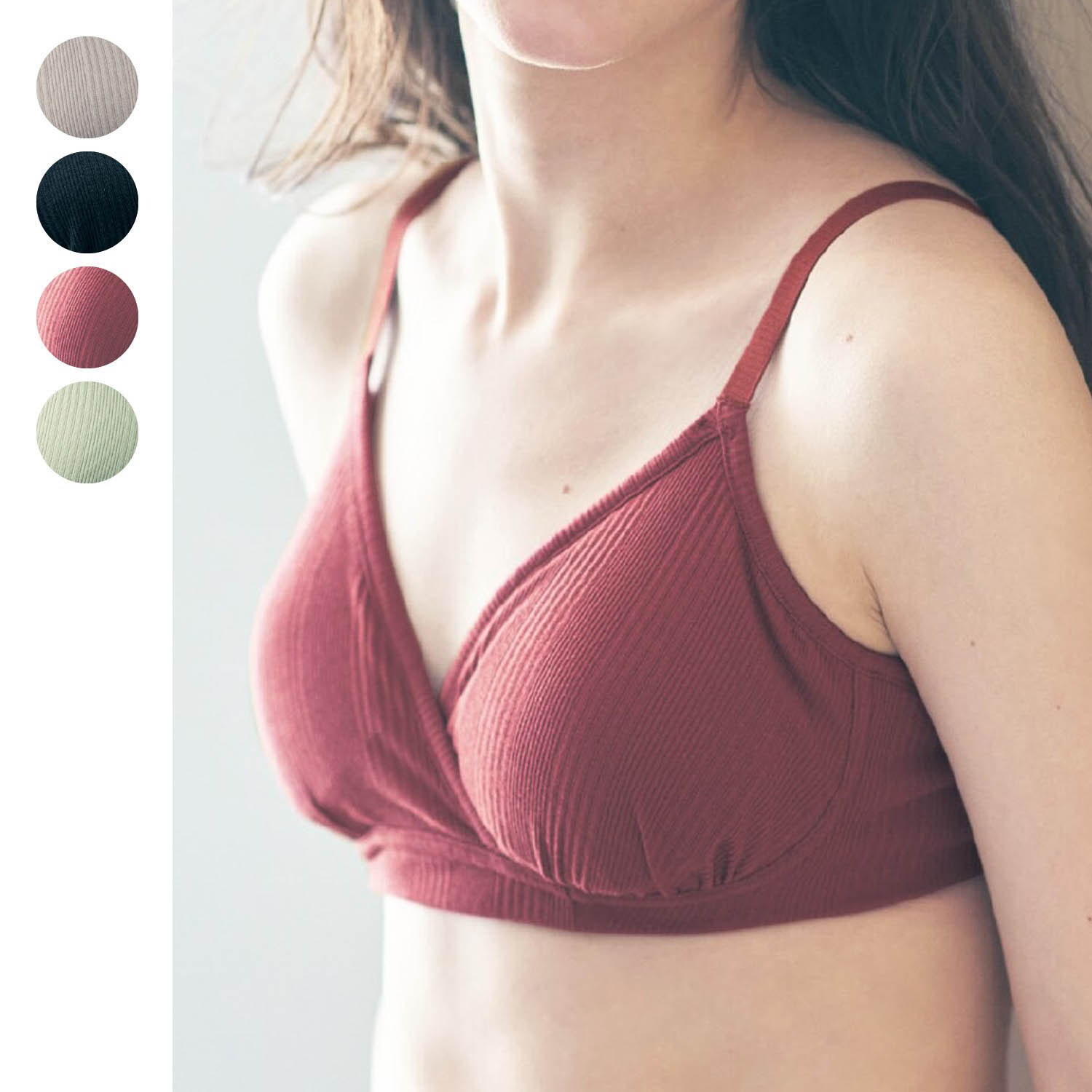 【うれしいポイント】・伸縮性があり柔らかな風合いのリブ素材・アンダーゴムが直接肌に当たらないくるみ仕様・幅広設計のU字バックで安定感のあるつけ心地・抗菌防臭効果で、菌を防ぎ臭いの発生を抑制・パッドはお好みで取り外しも可能サッと片手で簡単に授乳ができるブラ。締め付け感のないラクなつけ心地のノンワイヤータイプです。肌側にはやさしい肌触りの綿素材を使用。上下おそろいで着られる同シリーズのショーツもご用意しています。