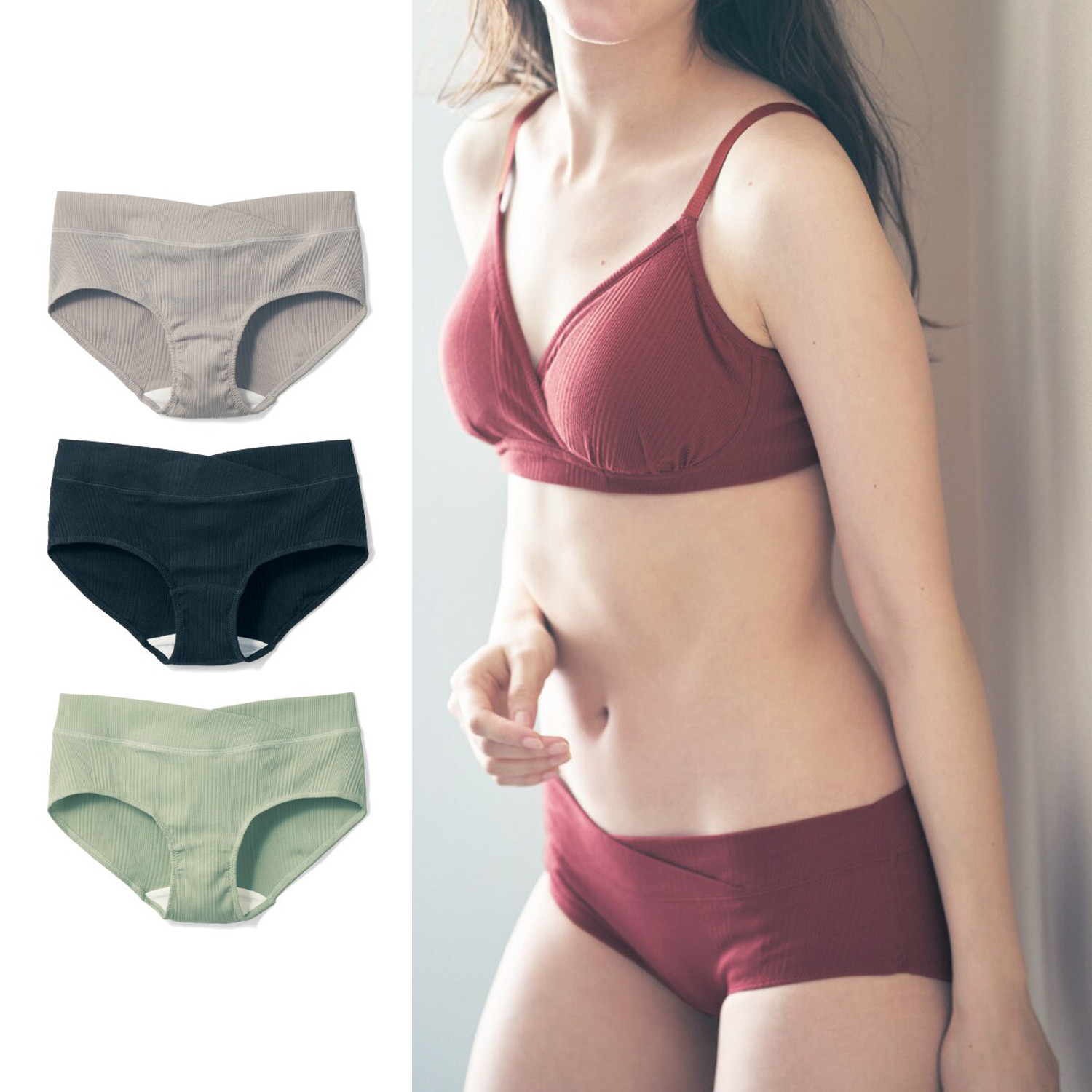 【うれしいポイント】・お腹が大きくなっても苦しくない浅ばきタイプ・抗菌防臭効果で、菌を防ぎ臭いの発生を抑制・直接肌に当たらない内ゴム仕様産前から産後まで長くはけるショーツ。柔らかな風合いのリブ生地で仕上げました。上下で着られるおそろいの授乳ブラを別売りでご用意しています。