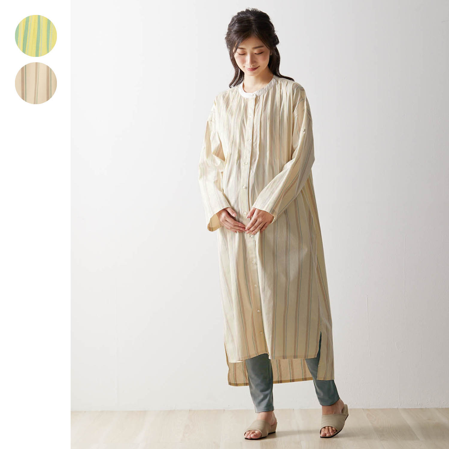 きちんと感のあるオックス素材のシャツワンピにゆとりをもたせたシルエットでラフさをプラスし、バンドカラーでアウターライクな印象を高めたパジャマ。フロントのピンタックやボタン使いなどこだわりのディテールがポイント。丸みのあるクリアボタン袖はロールアップできる仕様レギンスはウエストゴムのないタイプ