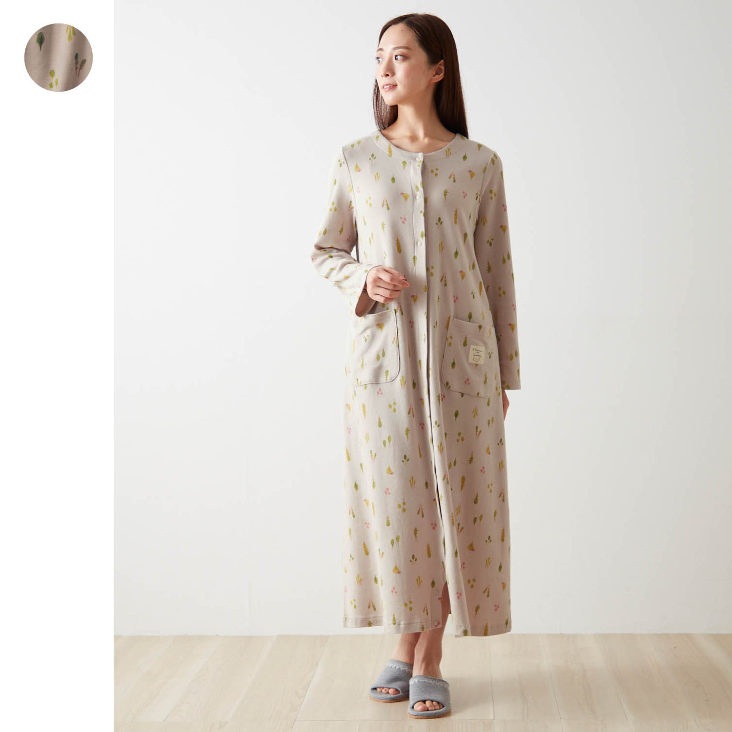 ーデザイン・スタイリングー・charcoal on canvas:画家・石田悦子さんオリジナルの総柄・目を引く柄はベビーリーフがモチーフ・左ポケットのプリントネームもポイント・ちらりと見えて可愛い配色の背当て布・背当てに「Charcoal on Canvas」のロゴプリントー素材ー・肌あたりなめらかな綿100%のスムース素材ー機能ー・股下ボタンを留めればロンパースになる2WAY・裾のまくり上がりを防げて、就寝時や診察時も安心・前開きスナップボタンで着脱も授乳もしやすい・家事や沐浴、点滴などに便利な袖ロールアップ仕様・左右にはハンカチがすっぽり入る大きめポケット