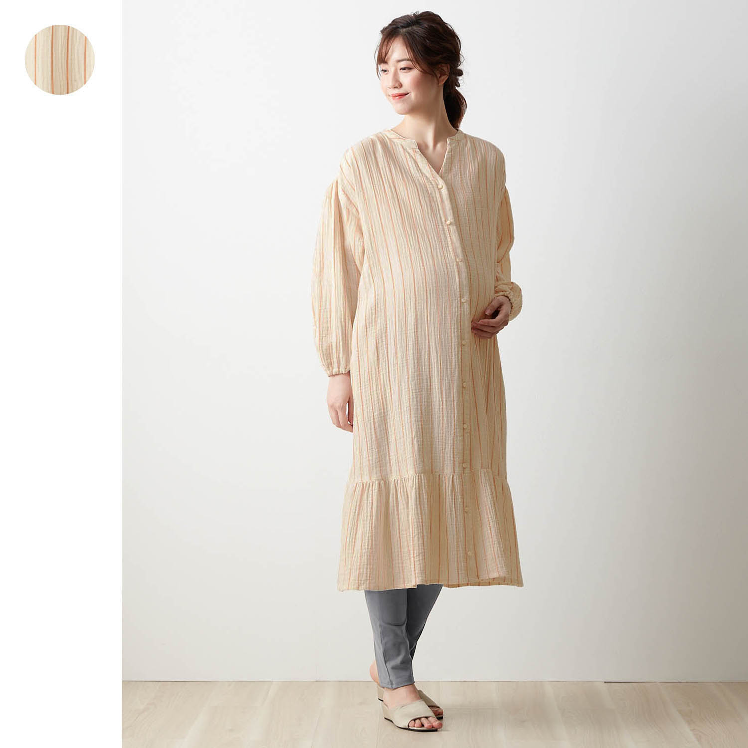 【2点セット】トップス/ボトムス▼トップス・女性らしいティアードシルエットのワンピース・ドロップショルダーのボリューム感のある袖も可愛い・前開きタイプで授乳しやすく産後の授乳もラクチン・袖口は腕まくりしやすいゴム入り仕様・サラッと着心地のいい綿100%素材▼ボトムス・ウエストはお腹をすっぽり包むカットソー・お腹にくい込まず、ラクなはき心地・お腹が小さいときや産後はウエストを折り返して着用可能