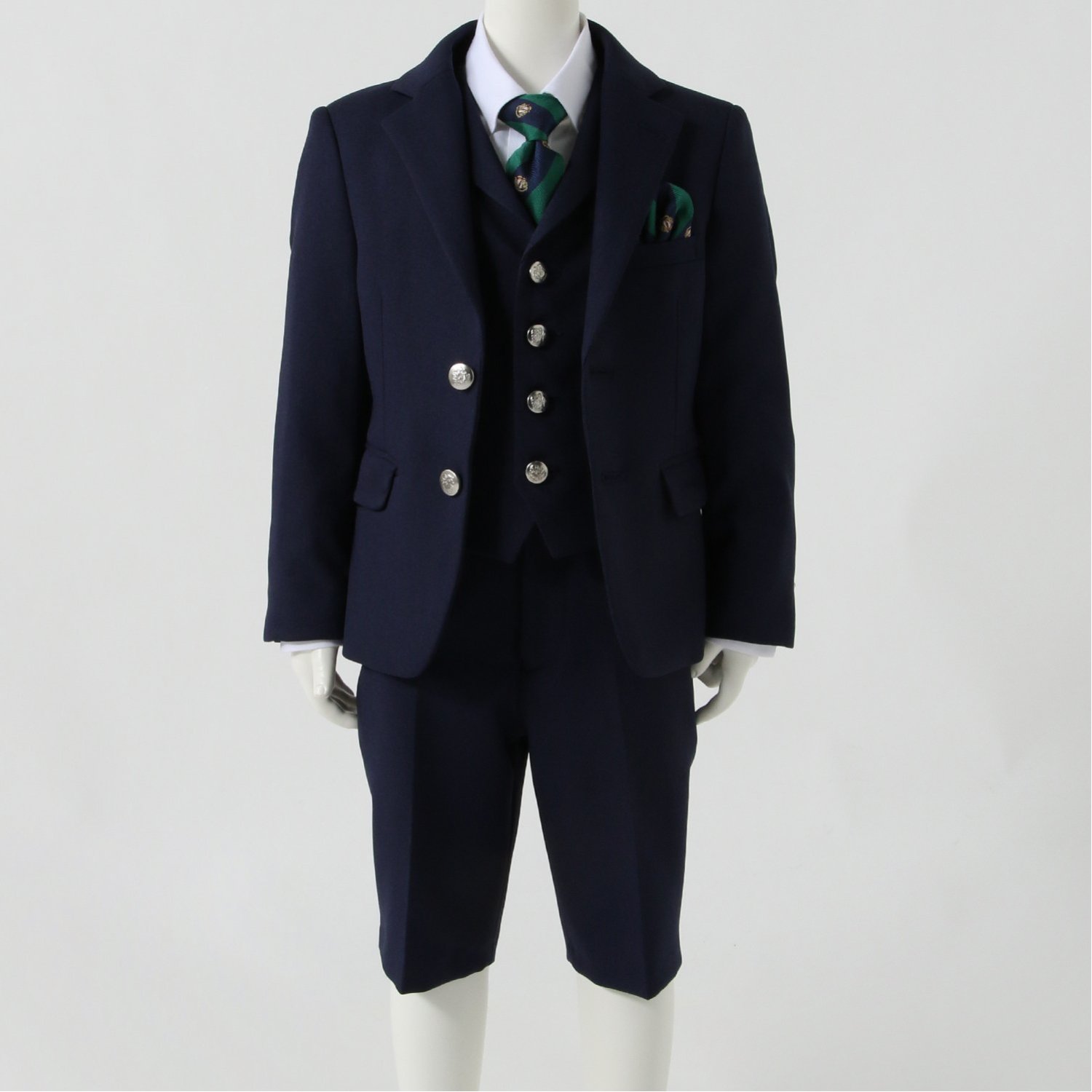 【こだわりのデザイン】・落ち着いた雰囲気を醸しだすバーズアイ柄・アクセントを添えるシルバーカラーのエンブレムボタン・ジャケットを脱いでもエレガントなベスト付き【お子さまが着やすいポイント】・簡単に取り付けできるネクタイ & ポケットチーフ・裾直しいらず & 動きやすいハーフ丈パンツ・ラクにはける後ろウエストゴム仕様フォーマルシーンで大活躍するスリーピーススーツです。英国風のストライプネクタイ & ポケットチーフがおしゃれなアクセントに。ベストやジャケットの組み合わせ方次第で、着こなしの幅が広がります。