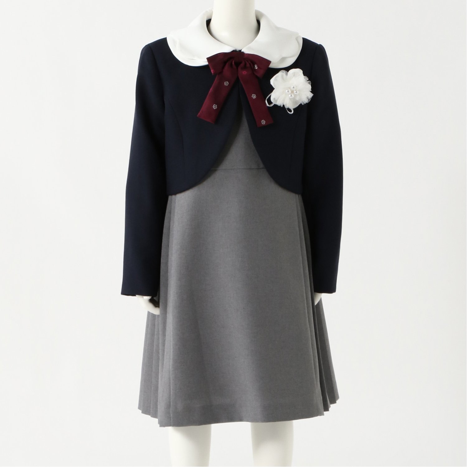 【きちんと見えが叶うボレロ】・清潔感と甘さのあるスカラップ & 丸襟・サッと簡単に留めやすいスプリングホック・リボンとコサージュは取り外しも可能【ディテールにこだわりが光る1枚】・すっきりとしたノースリーブワンピース・サイドにプリーツ加工を施した上品なデザイン・スタイルアップ効果が狙える胸下切替えクラシカルで上品な印象のボレロワンピーススーツセット。付属のリボンとコサージュを取り外してもお使いいただけます。卒園式や入学式、発表会など様々なフォーマルシーンで活躍。