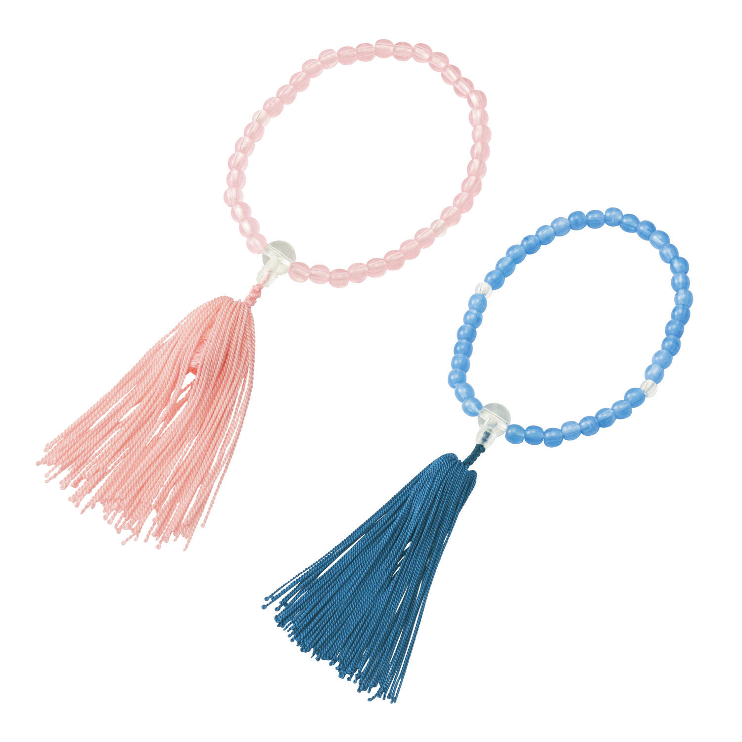 ーデザイン・スタイリングー・お子さんと一緒に手を合わせられる子どもサイズ・幼児から小学生くらいまでのお子さんにおすすめ・きれいな色調のピンクとブルーから選べますー機能ー・玉部分は樹脂で割れにくく安心・伸びるゴム仕様で扱いやすさもグッド