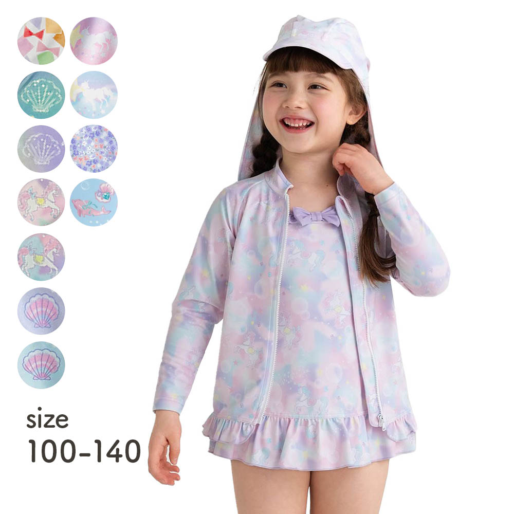 ーデザイン・スタイリングー・人気のユニコーンモチーフやシェル柄が可愛さ満点・裾のフリルがガーリーなニュアンス・水辺のシーンでも素敵に輝くデザイン性ー機能ー・安心のファスナーガード付き