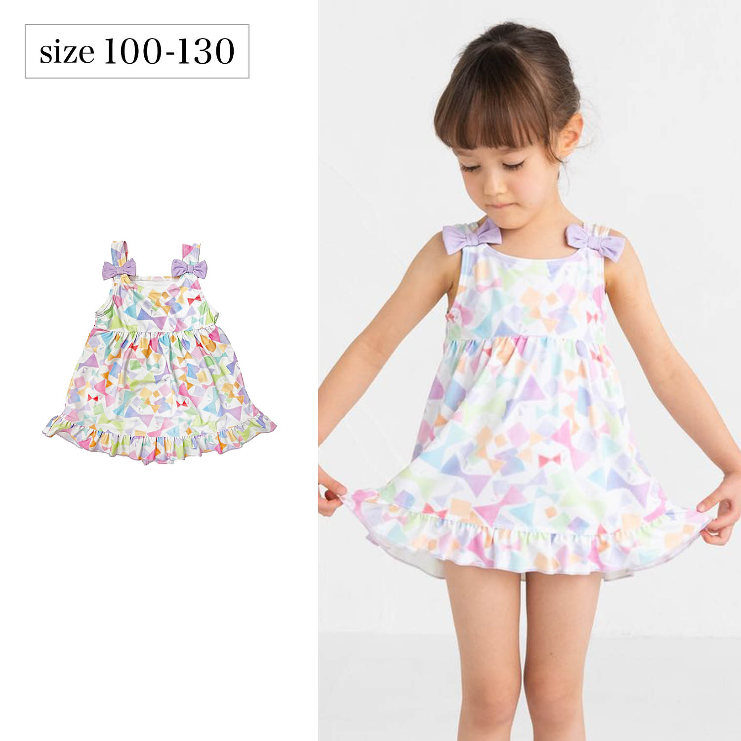 ―デザイン・スタイリング―・パッと目を惹く両肩のリボンモチーフ・ソフトな色合いの総柄でやさしい印象に・裾にフリルをあしらい、かわいらしさアップ―機能―・UVカット効果で紫外線からしっかりお肌をカバー・胸・背中・マチ部分は裏地付きで透け防止に◎