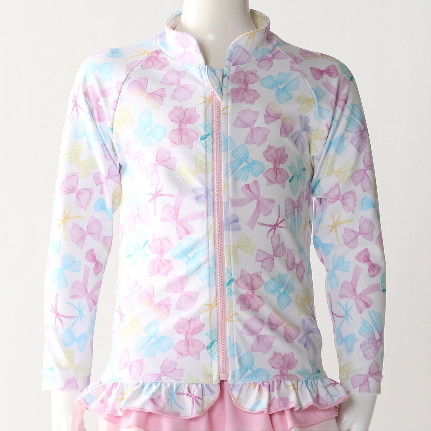 ―デザイン・スタイリング―・遠くからでも目を惹くキュートなデザイン・スタンドカラーが、首まわりを日差しからガード・肩や腕まわりの動きを邪魔しないラグランスリーブ・ひらひら揺れる裾のフリルで、さらに愛らしく!―素材―・紫外線からお子さまを守るUVカット効果のある生地―機能―・ファスナーの引き手が直接肌に当たらないカバー付き