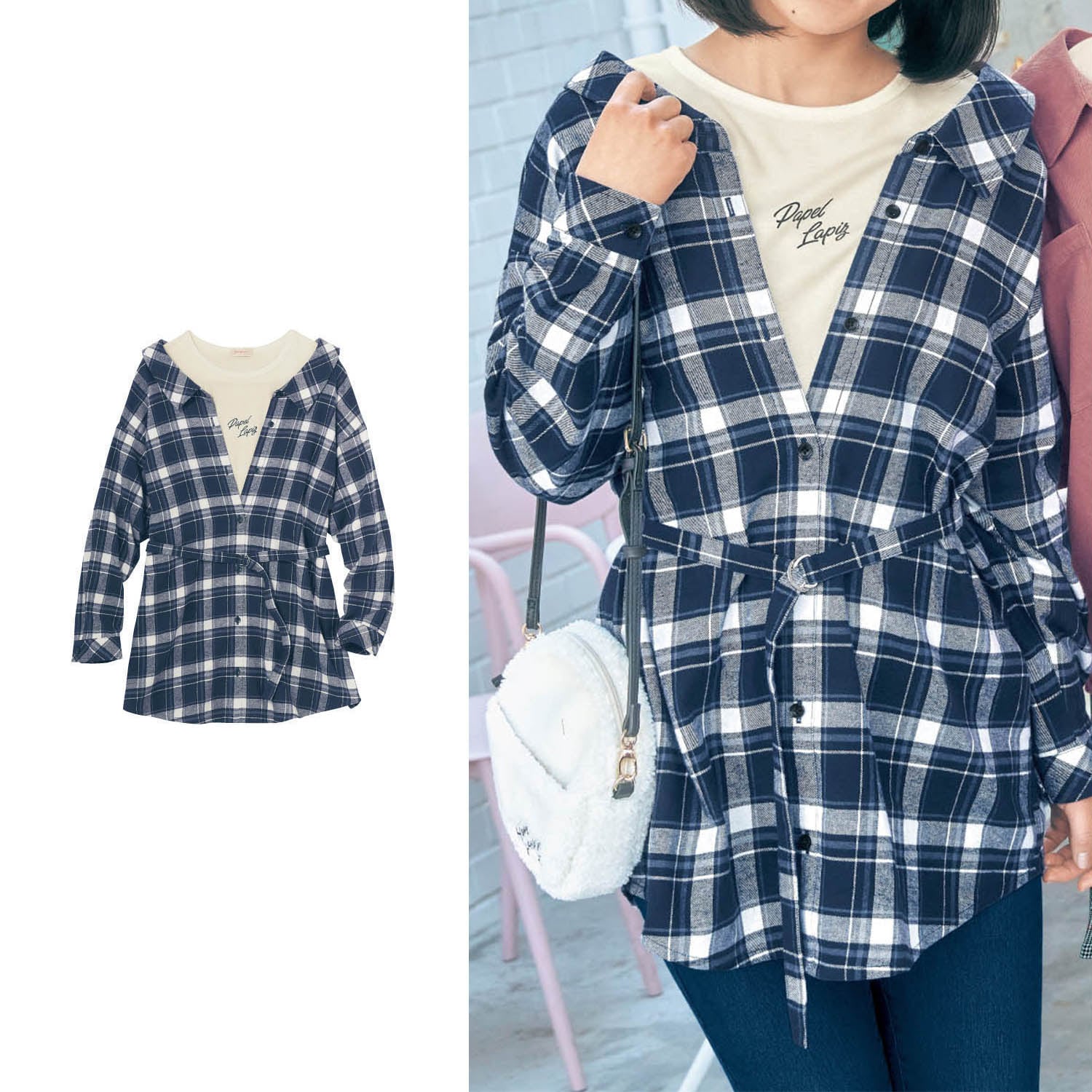 ―デザイン・スタイリング―・チェックシャツ×ロゴTシャツのレイヤード風デザイン・固定デザインで抜き襟コーデが簡単に完成・ベルトを付けるとメリハリがでて、外すとゆったりラフに印象チェンジ・さりげなくのぞくTシャツのロゴもポイント―素材―・チェックシャツ部分は秋冬らしい起毛素材・Tシャツ部分は肌あたりのよい綿100%のスムース素材Papel lapiz(パペルラピス)ワタシの「好き」にフィットする、トレンドをおさえた好感度の高いおしゃれを提案するブランド。今のリアルなジュニア & ティーンの体形に合わせた独自のサイズを設定し、細部の着心地にもこだわりました。