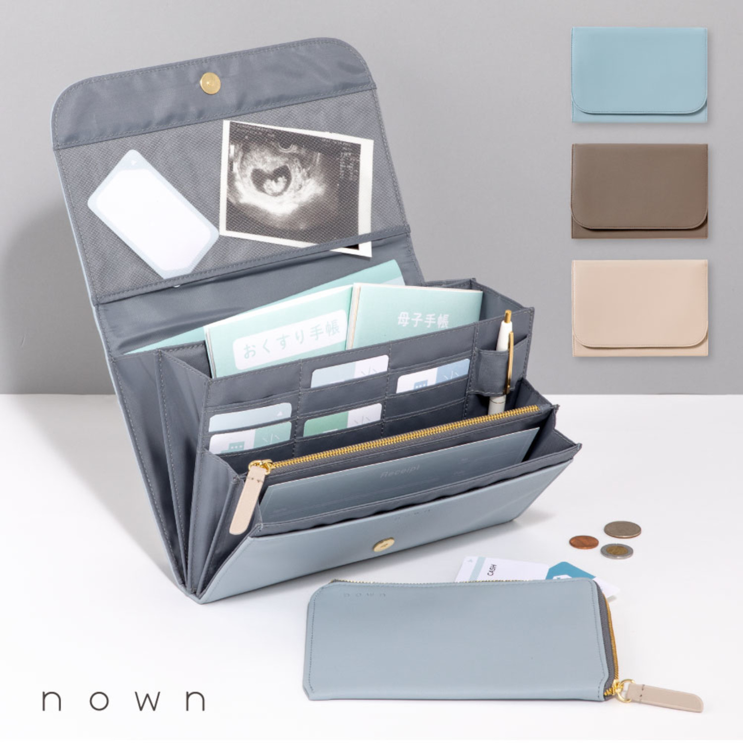 ≪家族みんなが使いやすい母子手帳≫赤ちゃんを抱っこしたまま片手でも扱いやすいよう、本体は開け閉めしやすいマグネットボタン中身がパッと見渡せるので、パパやおばあちゃんに通院してもらう場面でも、必要なものが見つけやすいずっと飽きずに長く使ってもらえるシンプルデザインママ目線でお気に入りを選べて、パパでも持ちやすいこだわりのカラー展開≪収納≫妊婦健診表や予防接種手帳など厚みのあるA5冊子もスッキリ収まるマチ付きジャバラポケットポケットは段差をつけた2サイズ設計。中に入れているものが見渡せて、自然と整理しながら入れられます。カードポケットには12枚収納、一番見やすい場所に。マスクを入れておけるメッシュポケットも≪単体でも使えるセパレートケース≫せっかく母子手帳ケースを購入しても、だんだんと丸ごと持ち歩く場面が減り、収納だけになってしまうのはもったいない・・・成長してからも使ってもらえるよう、通院時必要なものだけコンパクトに持ち出せるセパレートケースをつけました。背面ポケットにジャストサイズ。入れたままでも上からものが取り出せます!L字ジッパーで、大きく開いて中身が取り出しやすい≪成長後もマルチに使える工夫≫お子さんが大きくなったあとも、家族全員の通院ケースや通帳ケースなどとして使えます通帳ケースとして使う場合は、印鑑や振り込み用紙などをまとめて入れて、銀行にいくときにはセパレートケースに必要なカードと通帳だけを入れて持ち出せます。銀行の封筒がそのまま入るサイズなこともポイントチケットやクレジットカードをまとめるトラベルポーチ