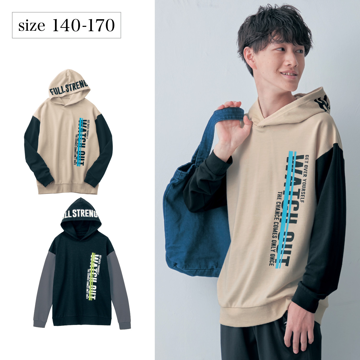 ―デザイン・スタイリング―・一枚でおしゃれな着こなしが完成・フロントの大きめロゴプリントがポイント・フードにもロゴをプリントして丁寧にデザインしました・袖の配色使いにもこだわりが漂います・トレンドのゆったりめシルエットで動きやすさも◎・リブ袖口でまくりやすいのも嬉しい―素材―・綿混カットソー素材で着心地も快適