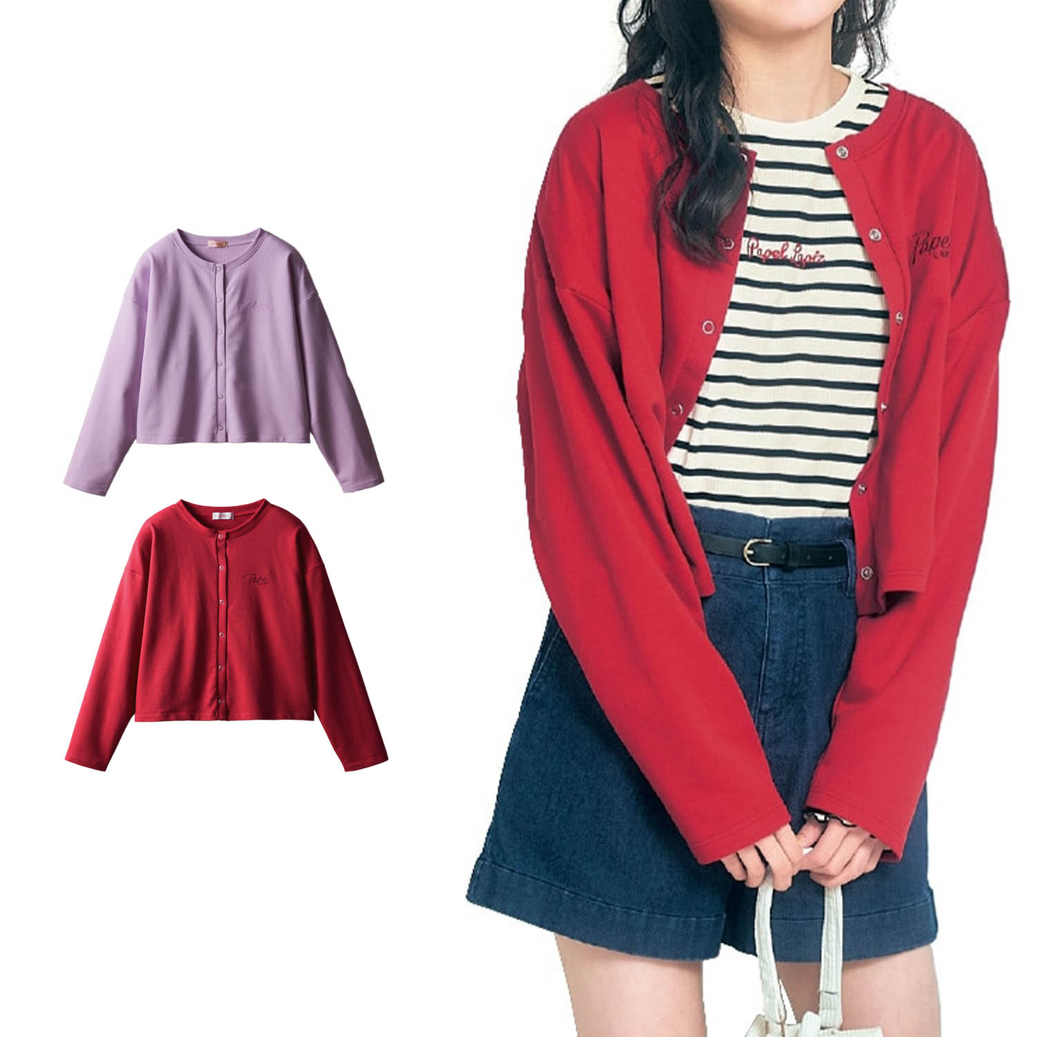 ―デザイン・スタイリング―・トレンドのショート丈でスタイルアップ・大人っぽいリングボタンがアクセント・左胸の刺繍ロゴがさりげないポイントに・定番から差し色まで選べるカラー展開・スカートにもパンツにも合わせやすい・ボタンを閉じるとプルオーバーとしても―素材―・通年着やすいミニ裏毛素材Papel lapiz(パペルラピス)ワタシの「好き」にフィットする、トレンドをおさえた好感度の高いおしゃれを提案するブランド。今のリアルなジュニア & ティーンの体形に合わせた独自のサイズを設定し、細部の着心地にもこだわりました。