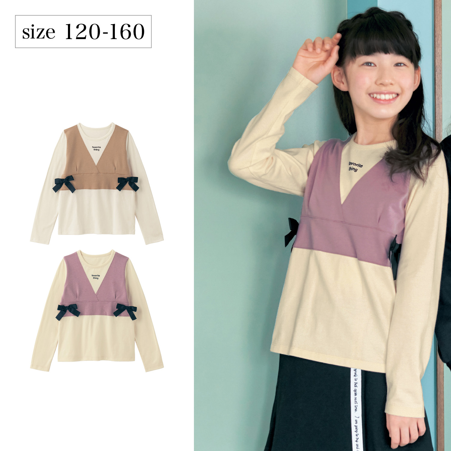 ―デザイン・スタイリング―・ビスチェを合わせたようなトレンド感のある重ね着風デザイン・大人っぽいムードのリボンをあしらい、程よい甘さをプラス・後ろにギャザーを寄せたバックシャンなデザイン・フロントのVラインで甘すぎない可愛さに―素材―・肌ざわりの良い綿100%カットソー素材