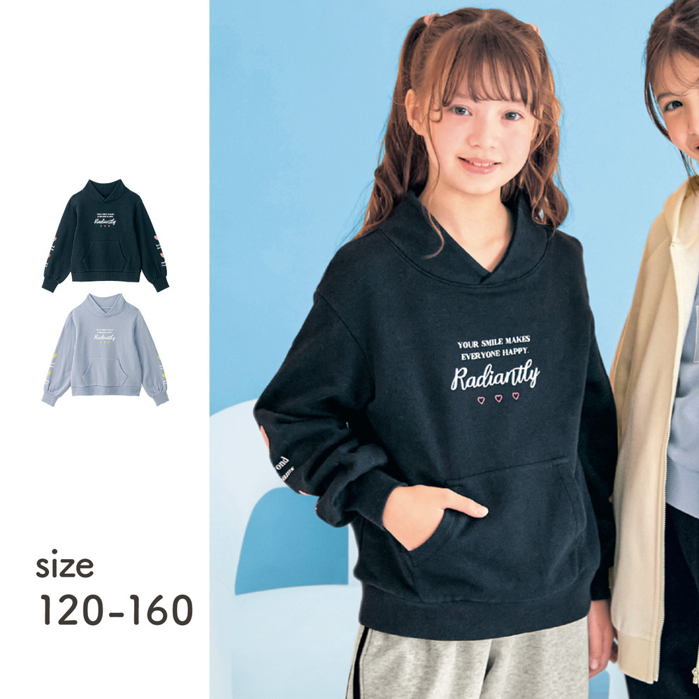 ―デザイン・スタイリング―・首元があたたかく、通学にも使いやすいフード風襟のプルオーバー・フロントのロゴや袖のハートが可愛いアクセントに・袖口ギャザーのふんわりとしたシルエットも愛らしさを後押し―素材―・身生地は肌ざわりの良い綿100%裏毛素材