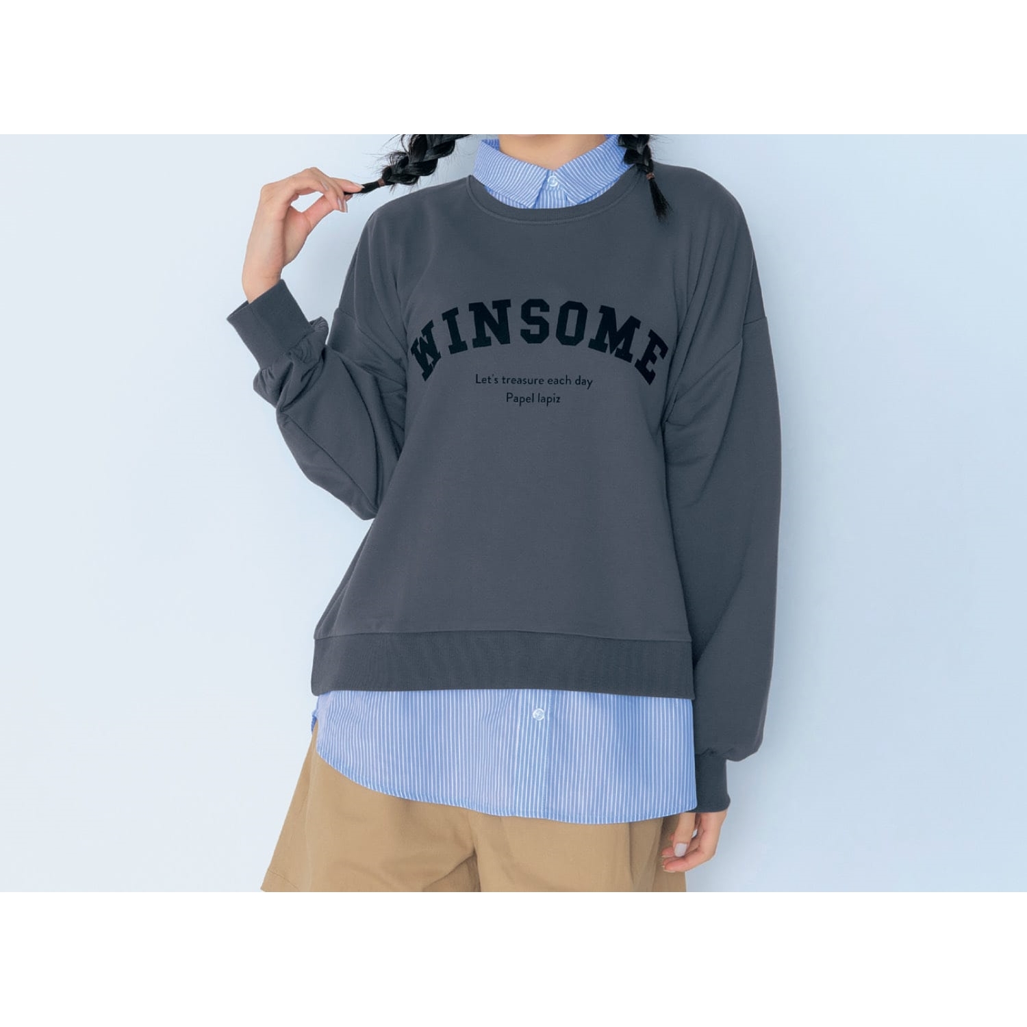 ―デザイン・スタイリング―・ストライプシャツ×プルオーバーのレイヤード風・胸元にトレンドのカレッジプリント入り・高見えするピンストライプ柄・シャツの裾は前後差のあるラウンドデザイン・襟のボタンは外せるので着用も楽ちん―素材―・身頃は通年着やすいミニ裏毛素材Papel lapiz(パペルラピス)ワタシの「好き」にフィットする、トレンドをおさえた好感度の高いおしゃれを提案するブランド。今のリアルなジュニア & ティーンの体形に合わせた独自のサイズを設定し、細部の着心地にもこだわりました。