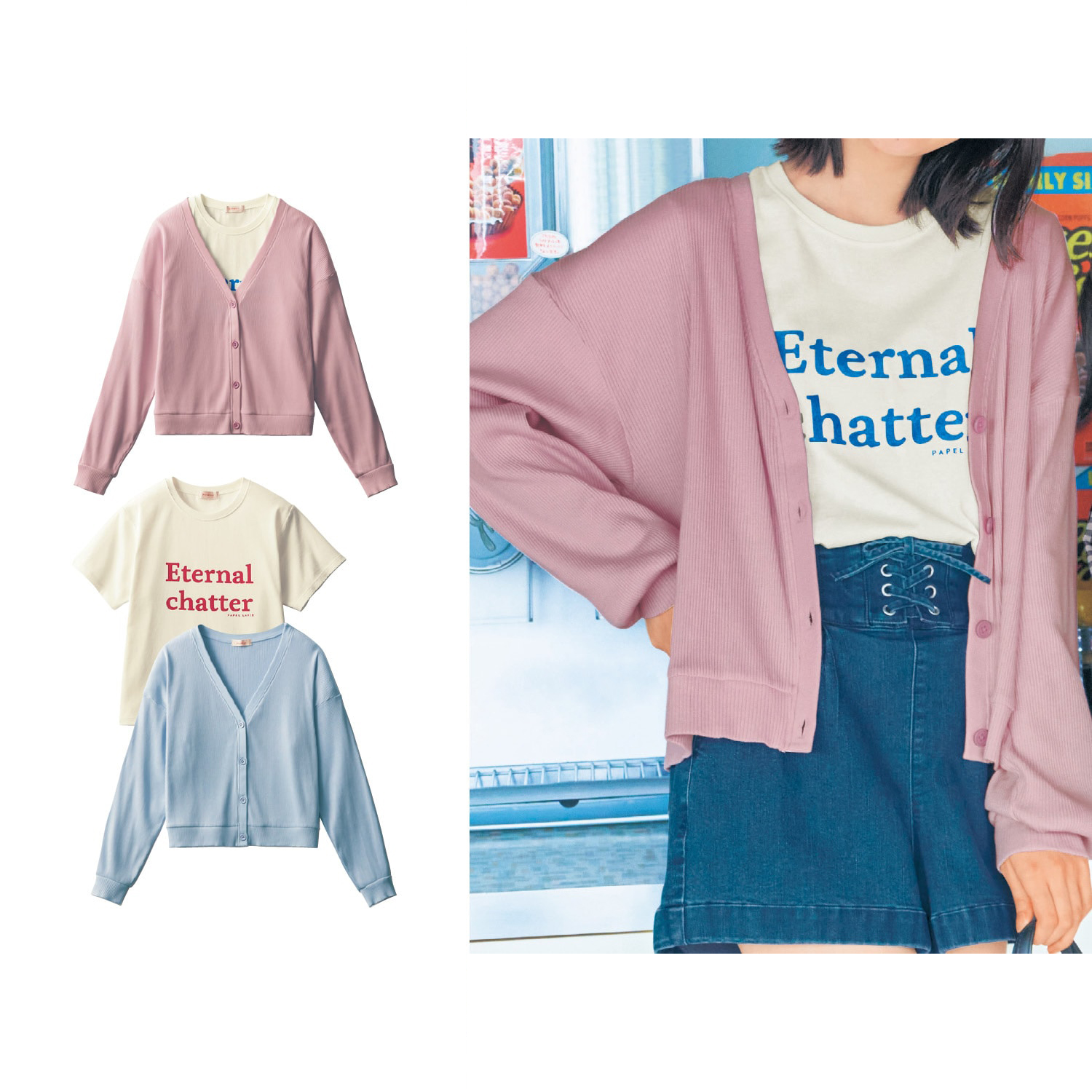 【2点セット】リブカーディガン/半袖Tシャツ▼リブカーディガン・程よい厚みでロングシーズン活躍・顔色をきれいに見せてくれるカラー・同色ボタンが可愛いポイント・ドロップ袖で重ね着しやすい・襟を抜いて着るとこなれ度アップ▼半袖Tシャツ・配色のロゴプリントがアクセント・すっきり見えるコンパクトなサイズ感・身生地は肌あたりのよい綿100%の天竺素材Papel lapiz(パペルラピス)ワタシの「好き」にフィットする、トレンドをおさえた好感度の高いおしゃれを提案するブランド。今のリアルなジュニア & ティーンの体形に合わせた独自のサイズを設定し、細部の着心地にもこだわりました。
