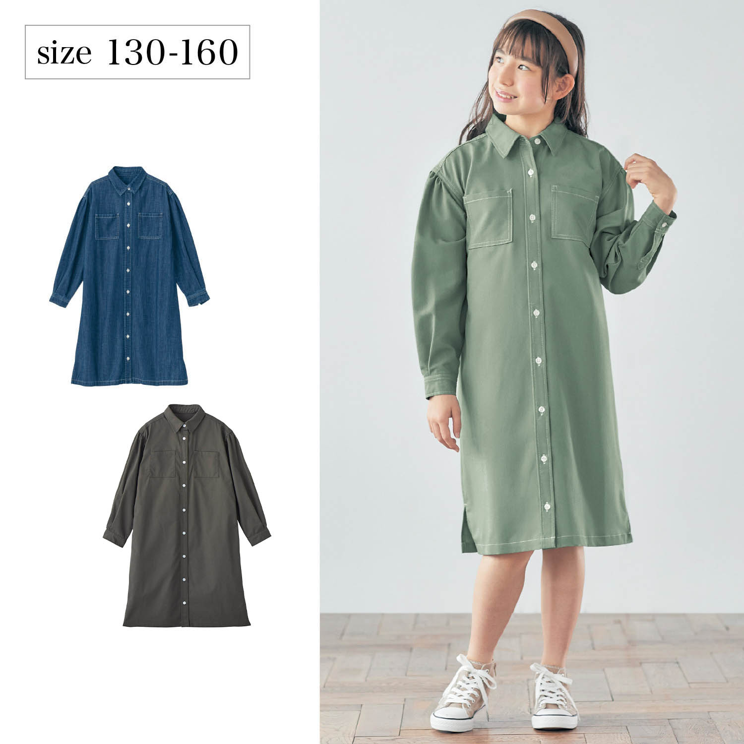 ―デザイン・スタイリング―・サッと着やすいシンプルなシャツワンピース・前を開けて羽織としても着こなせる・肩のギャザーで可愛らしい雰囲気に・配色ステッチがよりカジュアルな印象に・両胸と右脇にポケット付き―素材―・カラーによって適した素材を使用―機能―・油性ペンで直接書けてにじみにくいお名前スペース付き