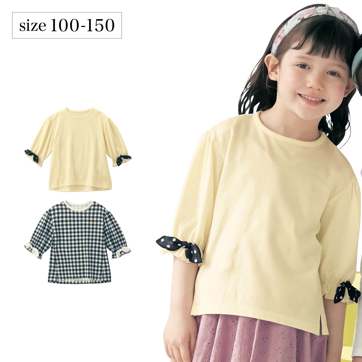 ―デザイン・スタイリング―・軽やかな印象の6分袖プルオーバー・シフォンリボンをあしらい可愛くデコレート・インもアウトも着こなしやすい、シンプルなシルエット・裾のサイドスリットもさり気ないポイント―素材―・本体はやわらかな着心地の綿100%天竺素材