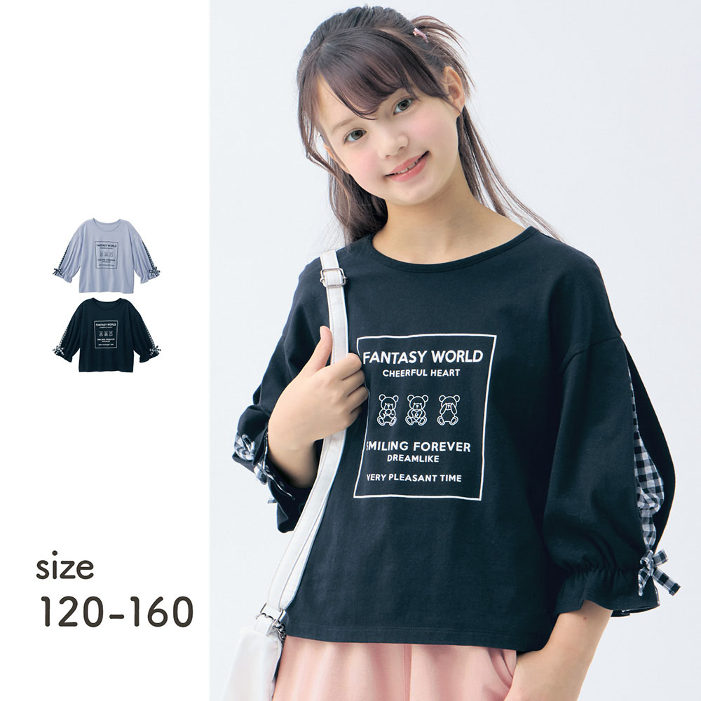 【ベルメゾン】チェック切替え6分袖パフTシャツ 【子供服】