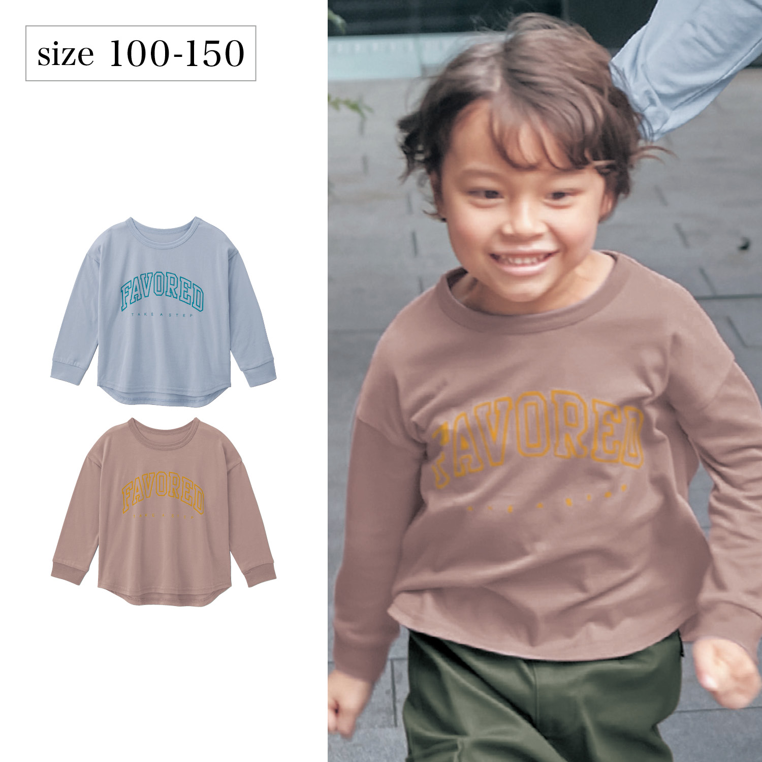 ―デザイン・スタイリング―・POPなビッグロゴが今っぽい長袖Tシャツ・裾のラウンドデザインもこなれた雰囲気・袖リブがあるのでもたつかず動きやすい・着まわしやすくおしゃれなニュアンスカラー―素材―・身生地はやわらかな着心地の綿100%天竺素材
