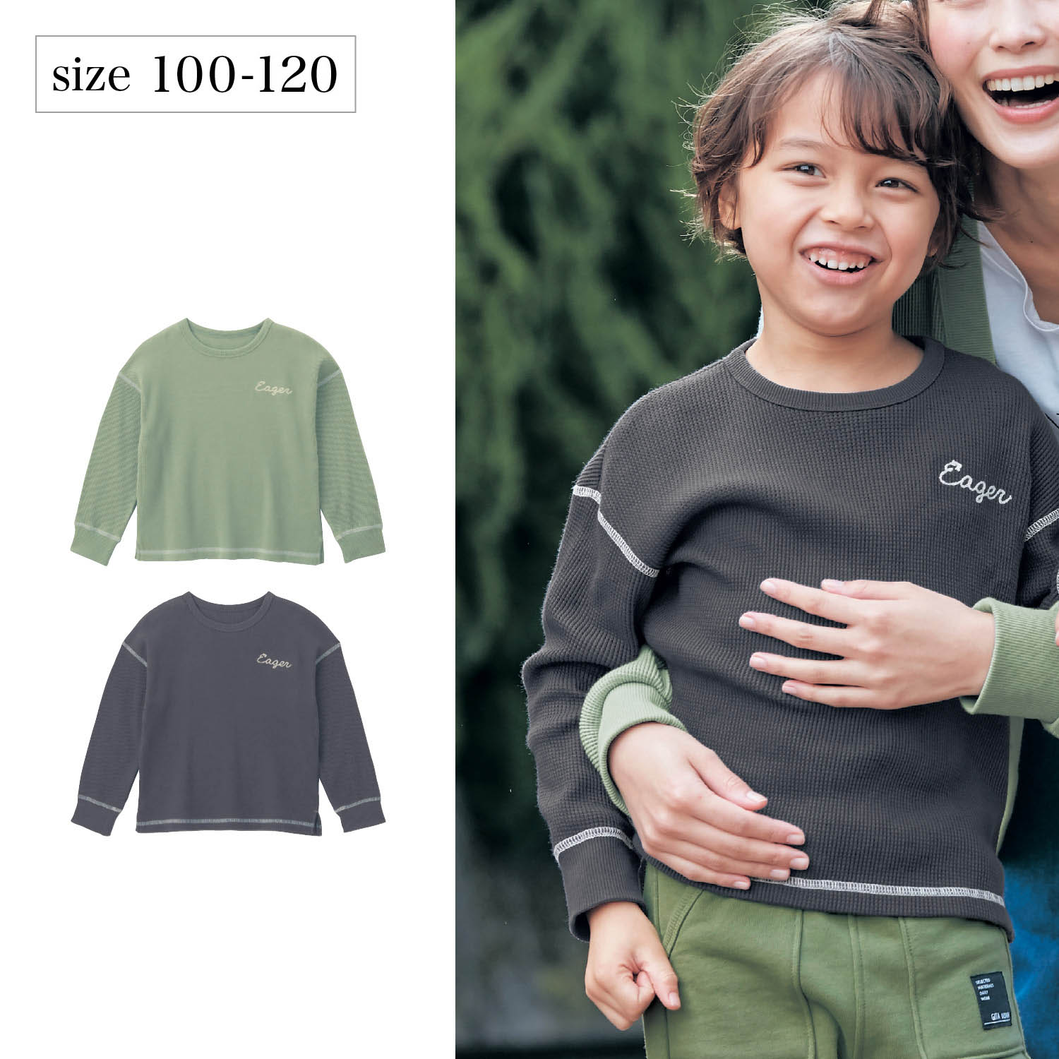 ―デザイン・スタイリング―・配色ステッチがおしゃれな1枚でも着映えるトップス・素材 & カラーでさり気ないおそろいを楽しめる・左胸にチェーンステッチ刺繍をあしらい、ワンポイントに・裾はサイドスリット入りでこなれた印象―素材―・サラリと着られる綿混ワッフル素材・程よい厚みで肌寒い季節にも重宝
