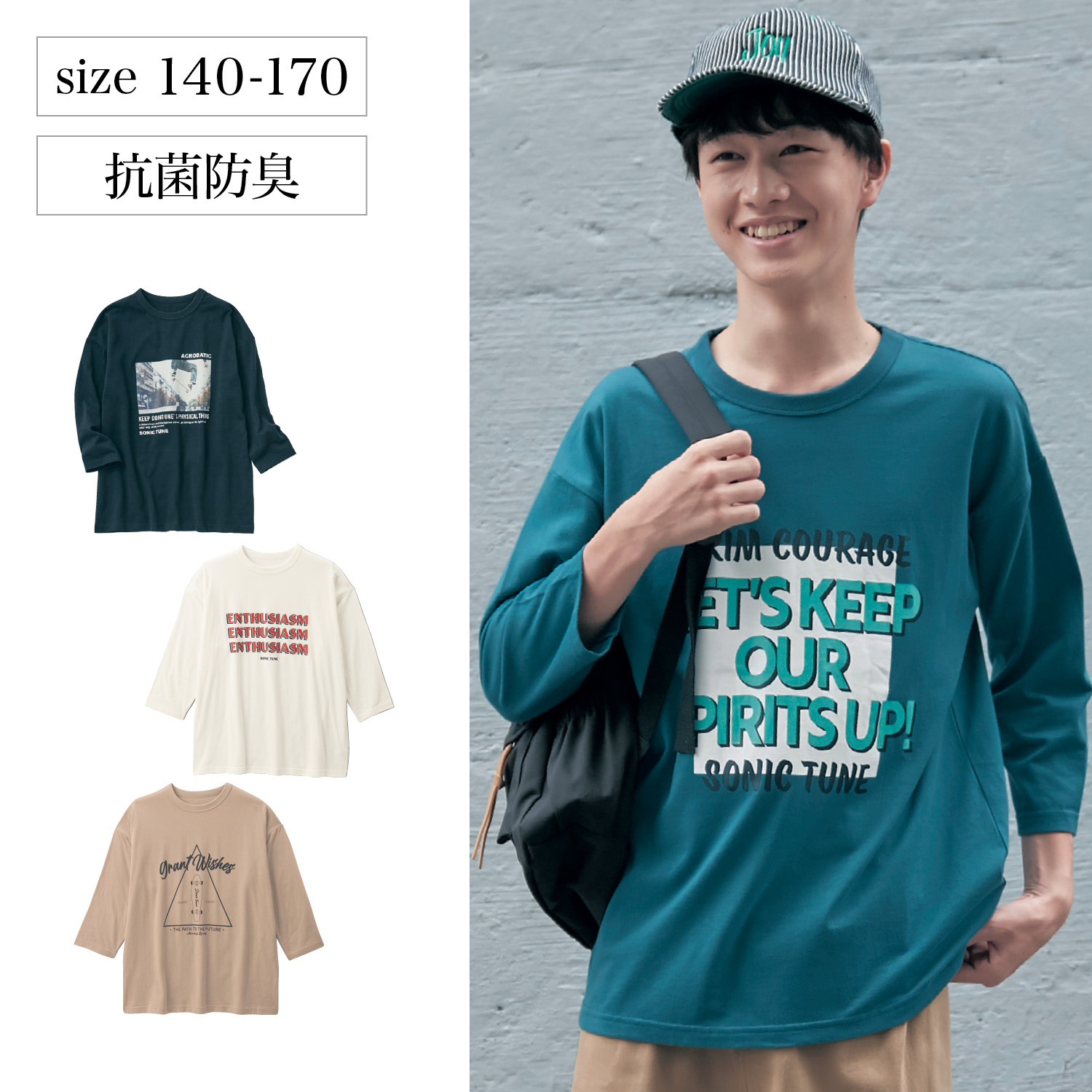 ―デザイン・スタイリング―・ロングシーズン使える七分袖Tシャツ・まくらなくても袖口が汚れにくく、手元が軽快に見える・存在感のあるフロントプリントもクール―素材―・身生地はやわらかな着心地の綿100%天竺素材―機能―・抗菌防臭加工でいつも気持ちよく着られるSONIC TUNE(ソニックチューン)ソニックチューンは日常の着こなしにぴったりな「シンプルでカッコよく」を提案するオリジナルブランド。成長期の男の子に合わせたサイズや機能にこだわったアイテムを175サイズまで展開しています。