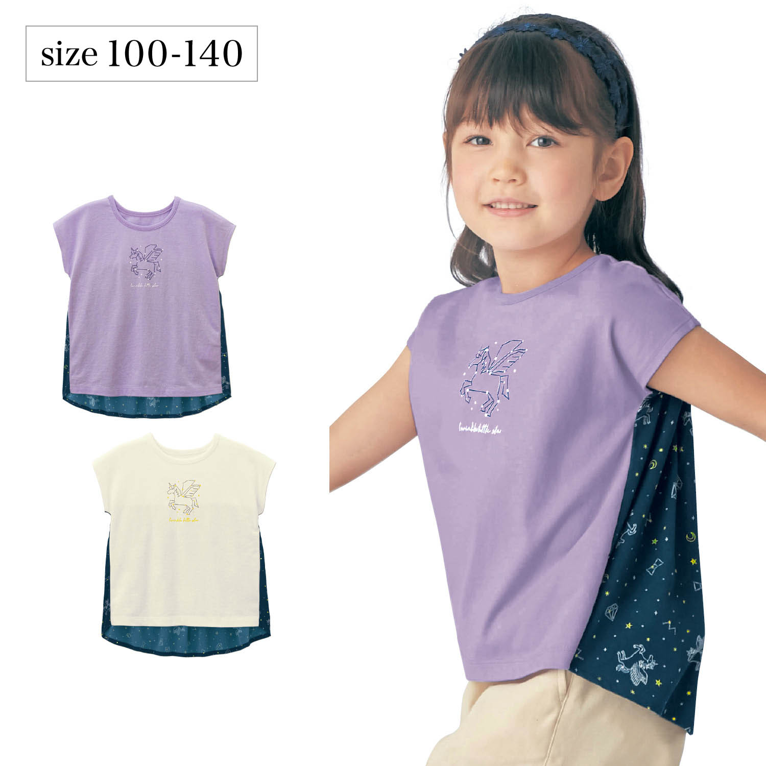 ーデザイン・スタイリングー・前に人気のペガサスモチーフをオン・後ろを星座風の星空モチーフで切替えたデザイン・どこから見られても可愛さ満点・風を通すふんわりシルエットが涼しげなニュアンスー機能ー・後ろやや長め丈でしゃがんでも背中が出にくいのも◎