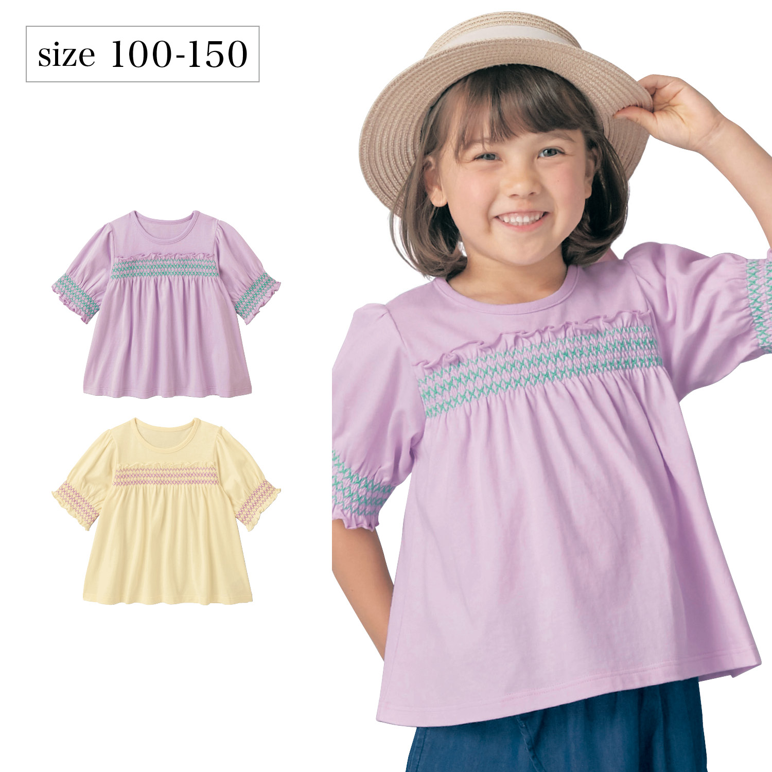 【ベルメゾン】配色スモッキング刺繍ブラウス風プルオーバー 【子供服 半袖】
