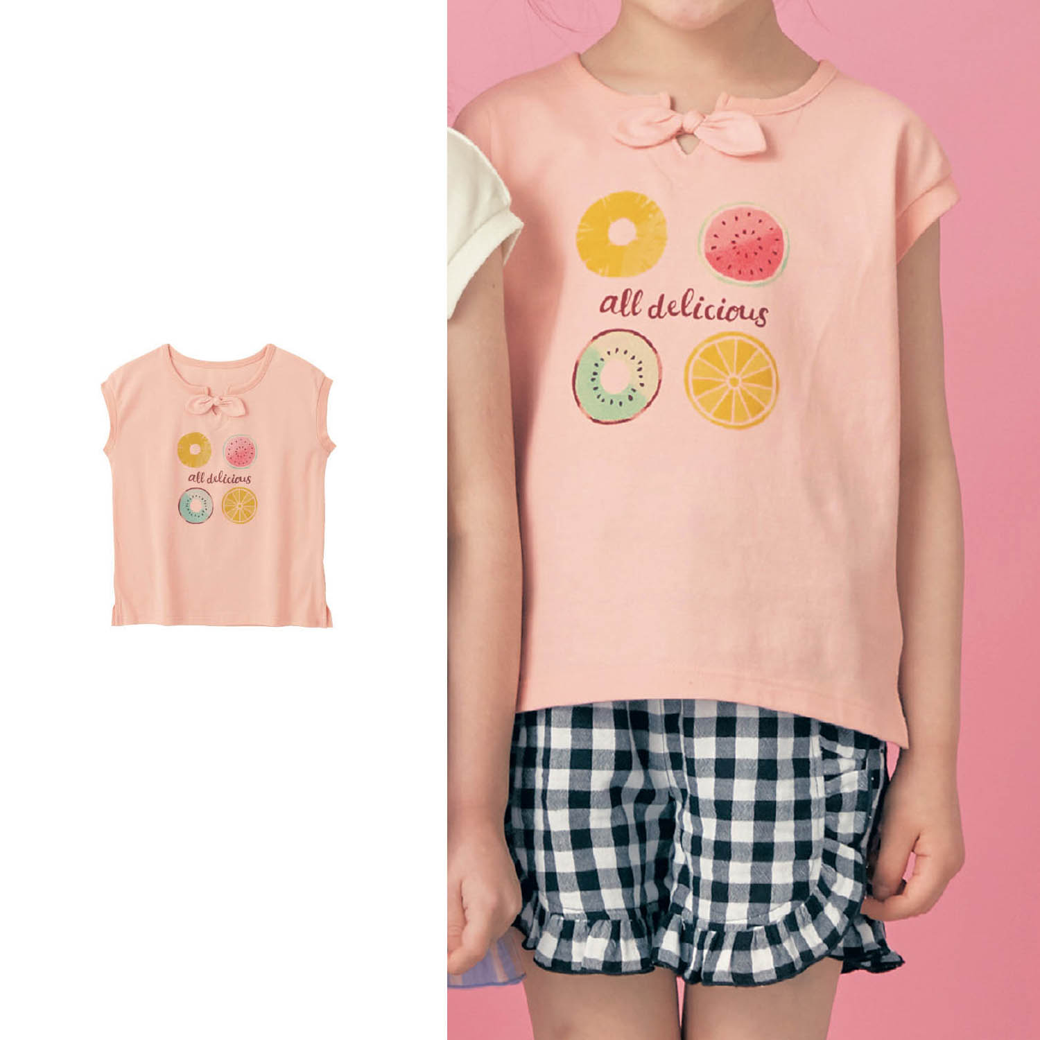 ―デザイン・スタイリング―・フレッシュなフルーツの断面イラストがPOPな印象・涼しげなフレンチスリーブも女の子らしさをアップ・ちらっと肌見えする襟元のリボンデザインもキュート―素材―・身生地は肌ざわりやわらかな綿100%天竺素材