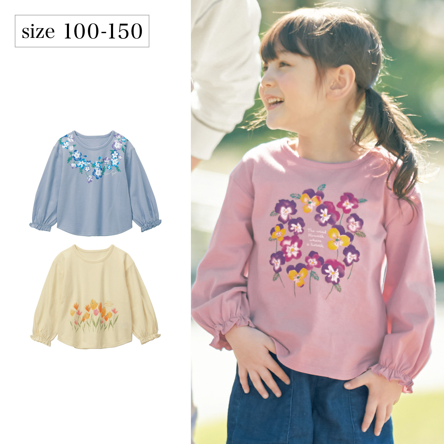 ―デザイン・スタイリング―・水彩画タッチの繊細な花のプリントが大人っぽい・袖フリルが愛らしさを後押し・裾のラウンドシルエットも旬な印象・1枚で着映えるデザインで、ワンツーコーデも可愛く決まる―素材―・身生地はやわらかな綿100%天竺素材で快適な着心地