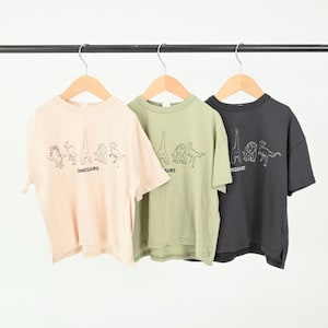 いろんな種類のカッコいい恐竜プリント!・バックプリントは恐竜の後ろ姿。・肩落ちゆるめシルエット。