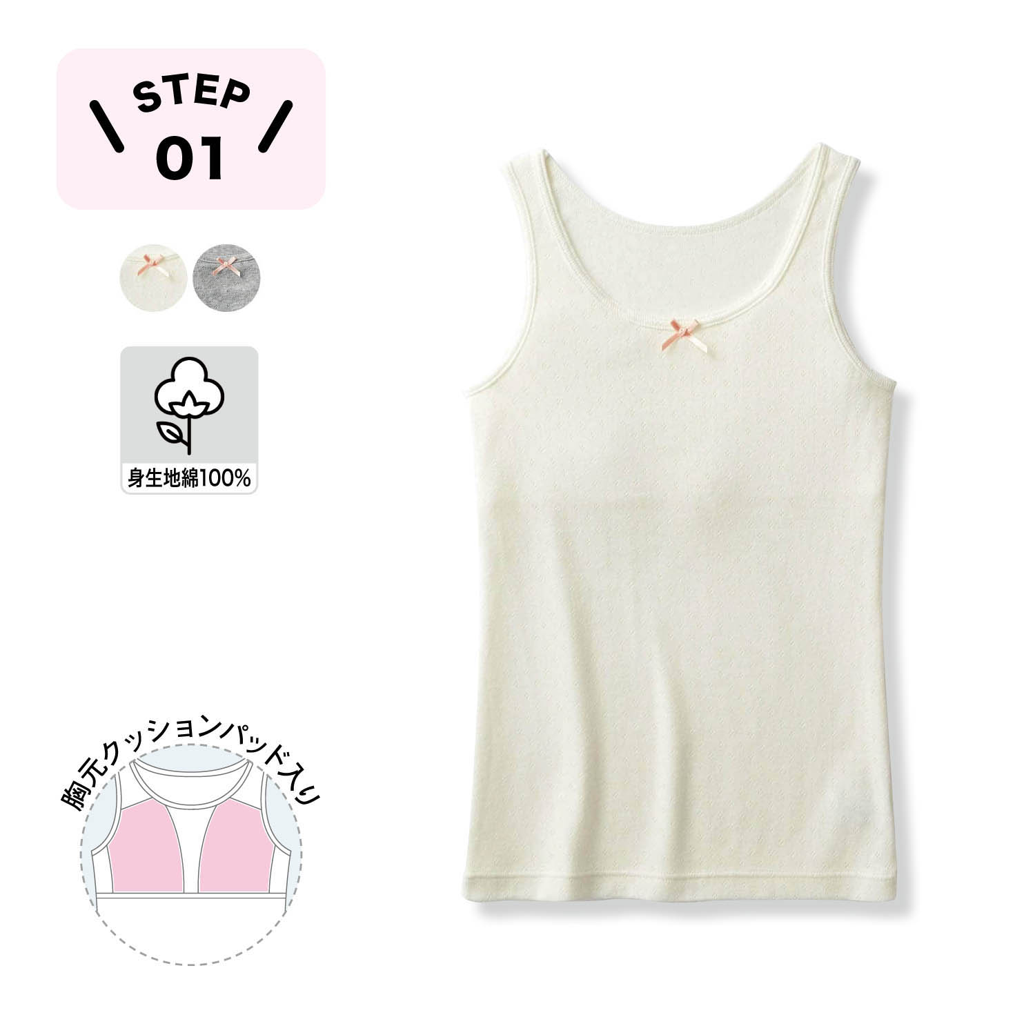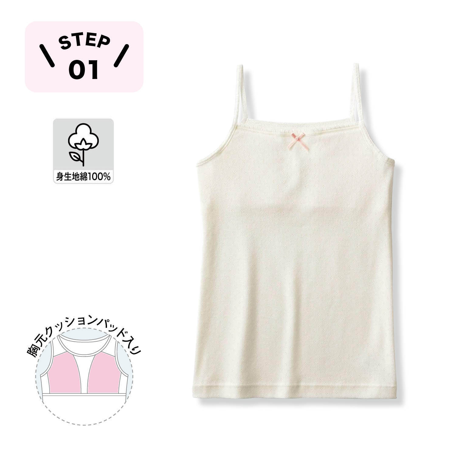 ―デザイン・スタイリング―・成長期の敏感なバストをやさしくカバーするインナー・バストを目立たせない、薄手のクッションパッド入り・ブラジャーは恥ずかしい、というお子様にもぴったり―素材―・身生地はお肌にやさしい綿100%パターンメッシュ素材―機能―・前身頃のみ、締め付け感のないアンダーテープ付き