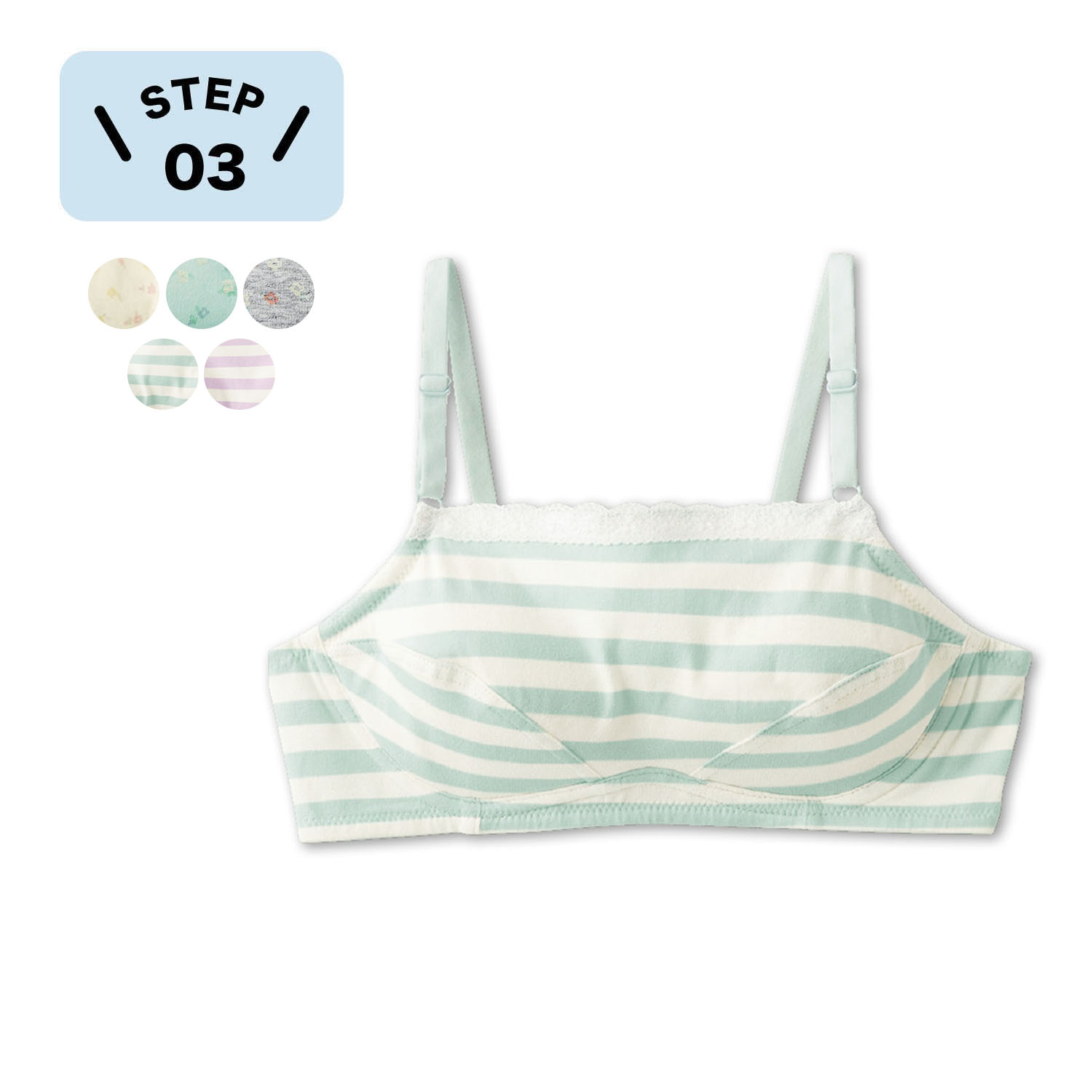 ―デザイン・スタイリング―・バストをラクにきちんと支えるノンワイヤーブラ・淡いカラーの可愛いデザインと、レース使いがポイント・ホックなしのかぶりタイプで着脱簡単・同柄のショーツもご用意―素材―・綿混素材で肌触りも良く快適な着用感・ストラップは薄手で肌あたりの良い微起毛テープを使用―機能―・クッションパッドとアンダーテープがバストをしっかりホールド・ストラップのアジャスターが前なので調節も簡単・ワイヤーがないので締め付け感ゼロ