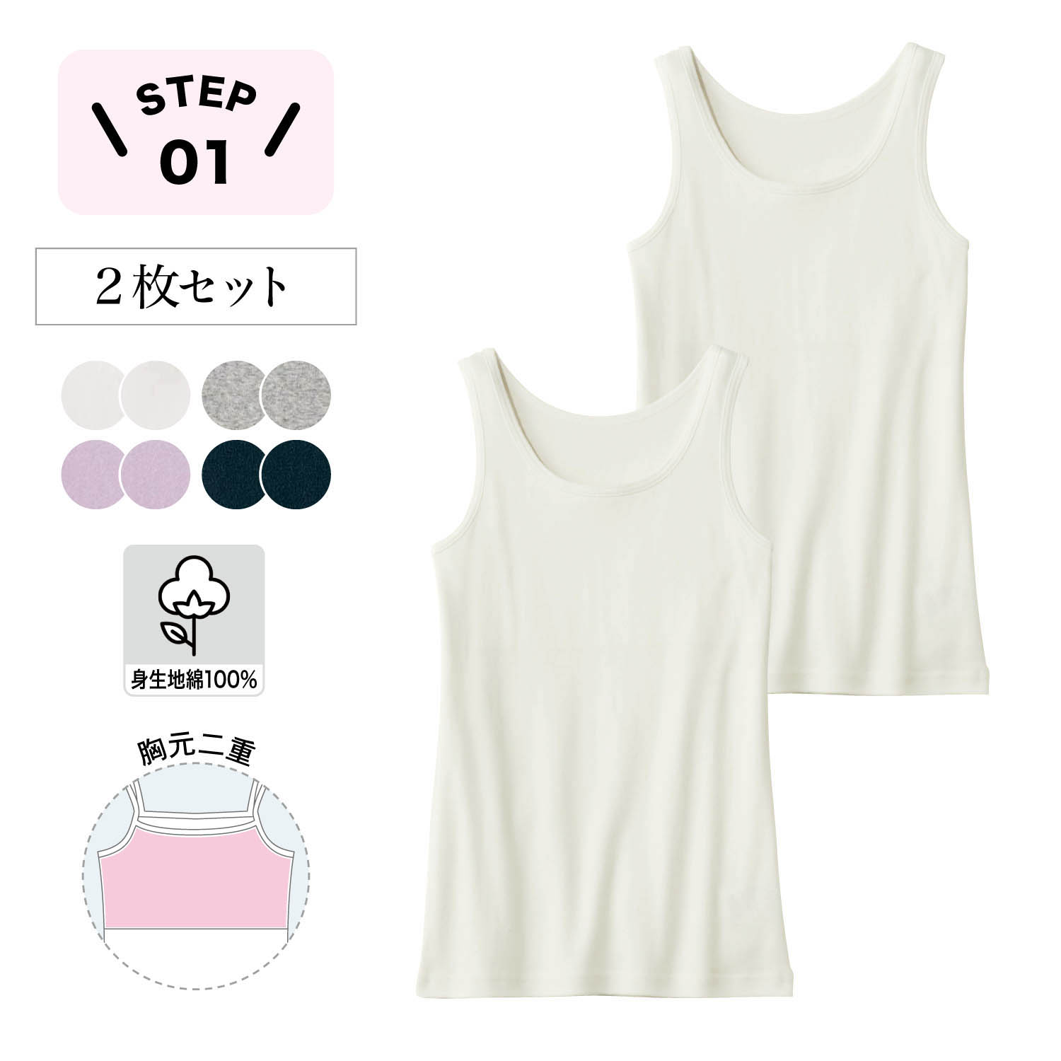 ―デザイン・仕様―・胸元が二重仕立てになったインナータンクトップ・からだのラインが変わってくる思春期の女の子におすすめ・ふくらみはじめたバストトップの透けを防ぎ、刺激からやさしくカバーします・シンプルなので通学用にもぴったりー機能ー・前身頃のバスト部分に、身生地と同素材の当て布で二重仕立てに・肩がズレにくく、安定感のある着心地―素材―・伸びが良くやわらかな綿100%のフライス素材