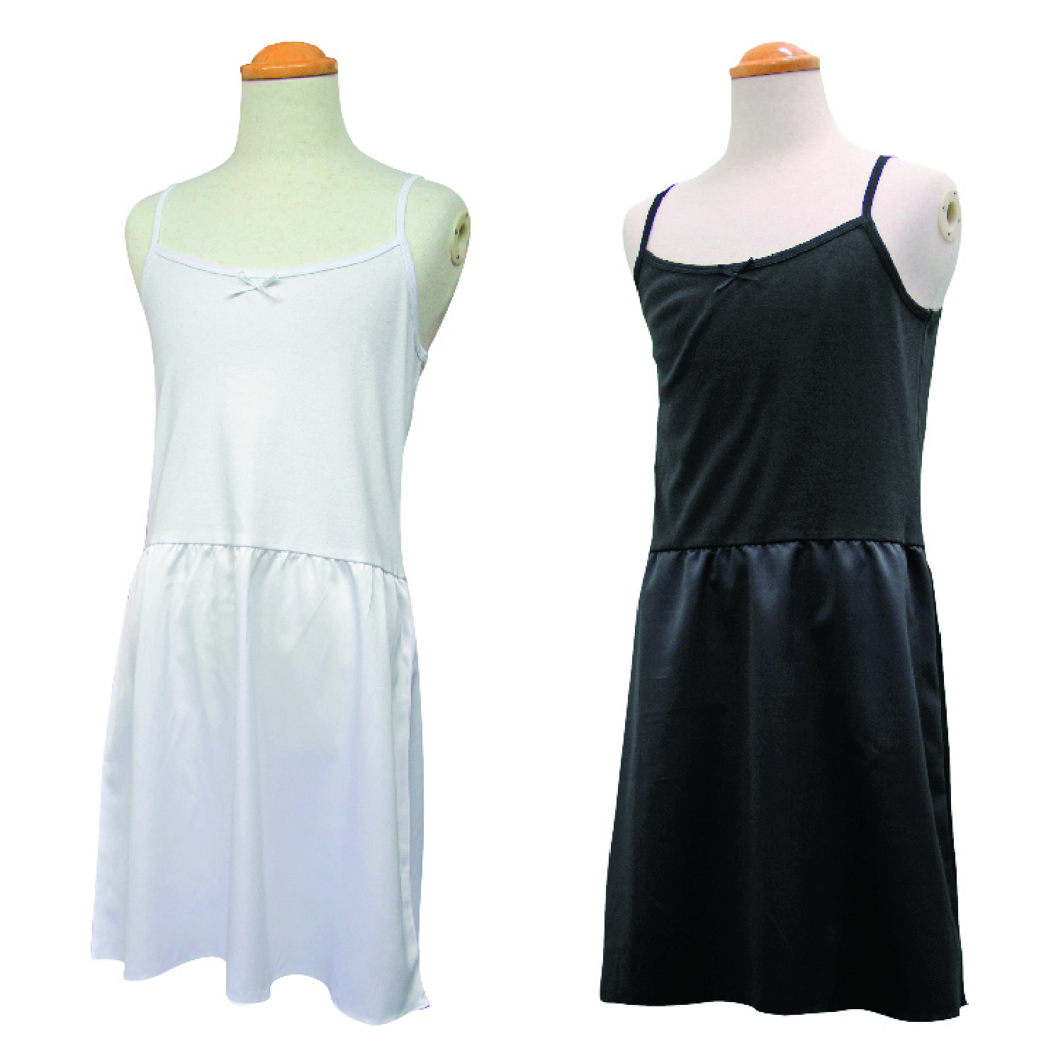 カットソー素材のキャミソールとスカート裏地が一体になった、1枚で便利に使えるスリップ。ワンピースを着る時はもちろん、スカートのコーディネートにも活躍します。襟元にさり気なくリボンをつけて、程よくアクセントをプラス。カットソー部分は、綿100%素材を使用しています。