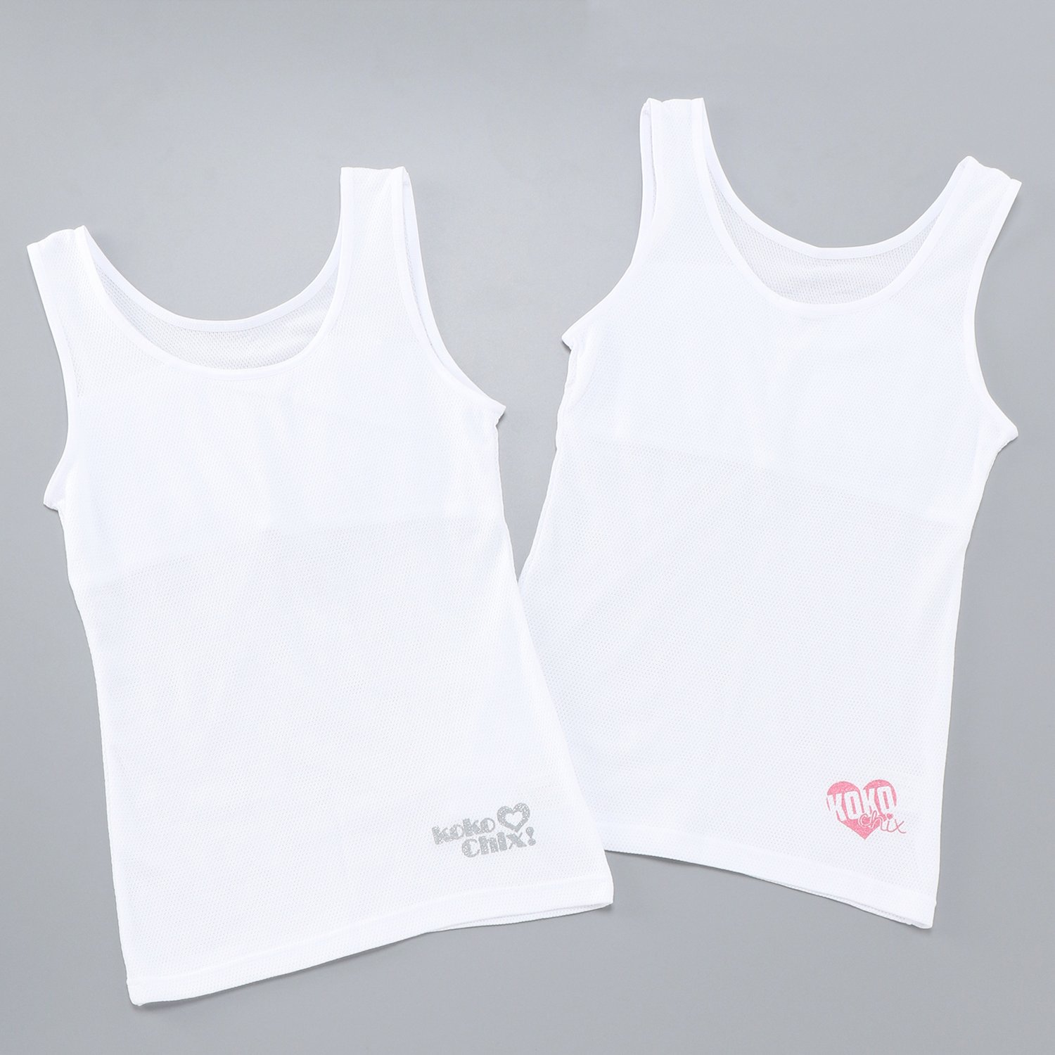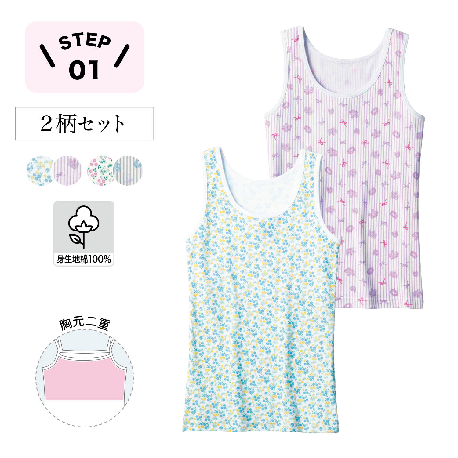 綿混のメッシュ素材を使用した、サラリと快適な着心地のタンクトップ胸部分はソフトな二重仕上げになっており、ふくらみはじめたバストをやさしくカバーします左裾のラメプリントがワンポイントになった、シンプルなデザイン内側にお名前タグ付き洗い替えにうれしい2枚セットです綿の様に柔らか中綿を内臓しているので肌あたり快適です