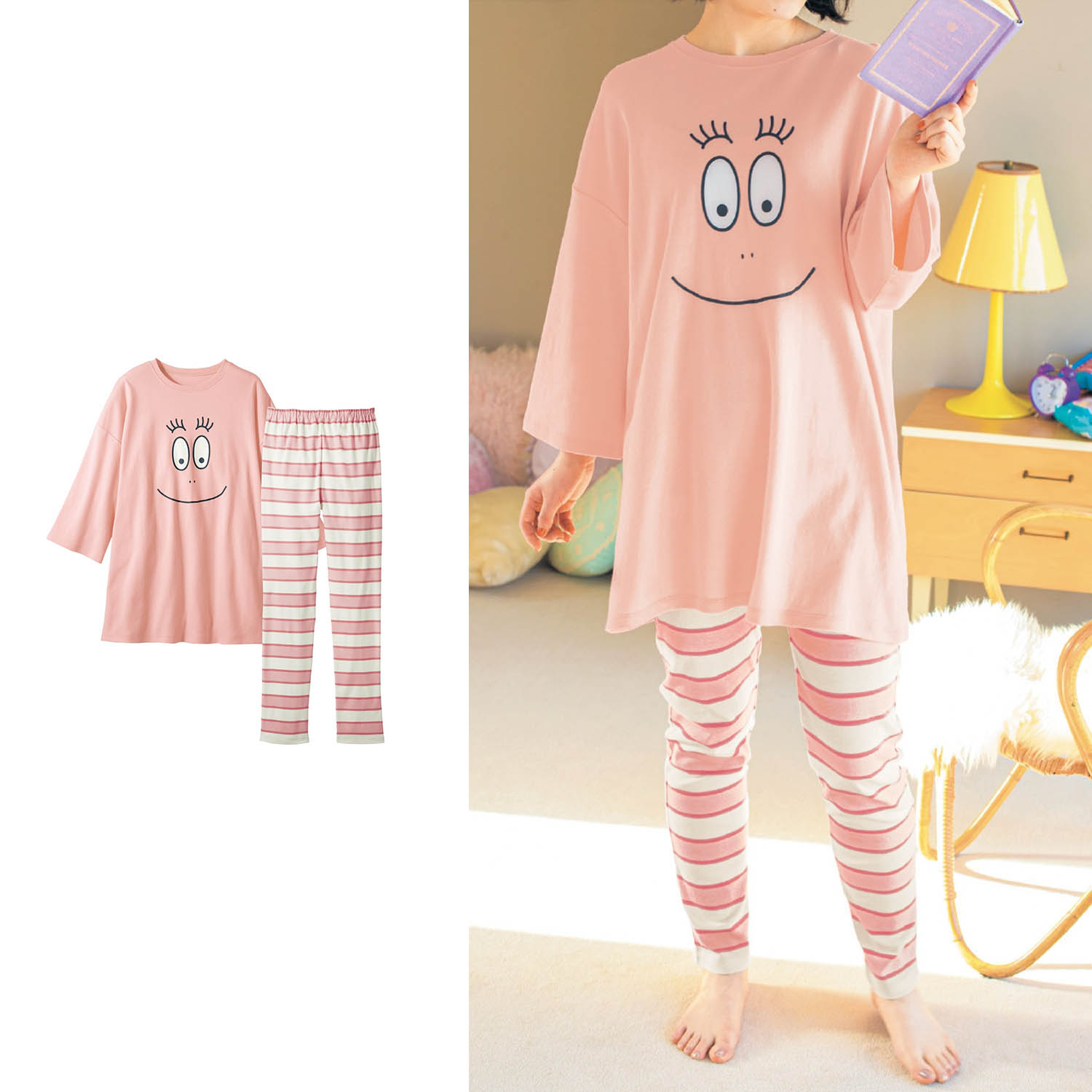 ―デザイン・スタイリング―・身幅広めで長め丈のゆったりTシャツにバーバパパのお顔がどーん!・ポップな配色のボーダーパンツを合わせてBIGシルエットに・着るだけでテンションアップするお目立ちデザイン・修学旅行や友達とのお泊まり会にも◎―素材―・肌ざわりなめらかなスムース素材で着心地も快適
