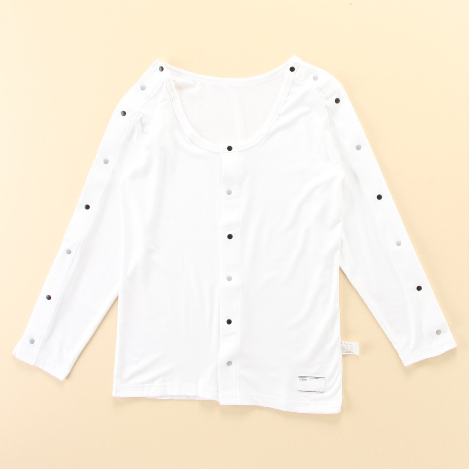 【入院時に最適!】・2色のスナップボタンでかけ違い防止・頭や腕を通さずお着替えできる前 & 袖開き仕様・左裾には名前が記入できるタグ付き【お肌にやさしいポイント】・柔らかくあたたかい裏起毛仕立て・動きやすい伸縮性のある素材で快適な着心地・金属アレルギーに配慮したプラスチック製のボタン入院時の快適さにこだわったお着替えしやすい長袖インナー。外付けの洗濯ラベルや裏起毛仕立てでお肌にやさしいのが魅力です。