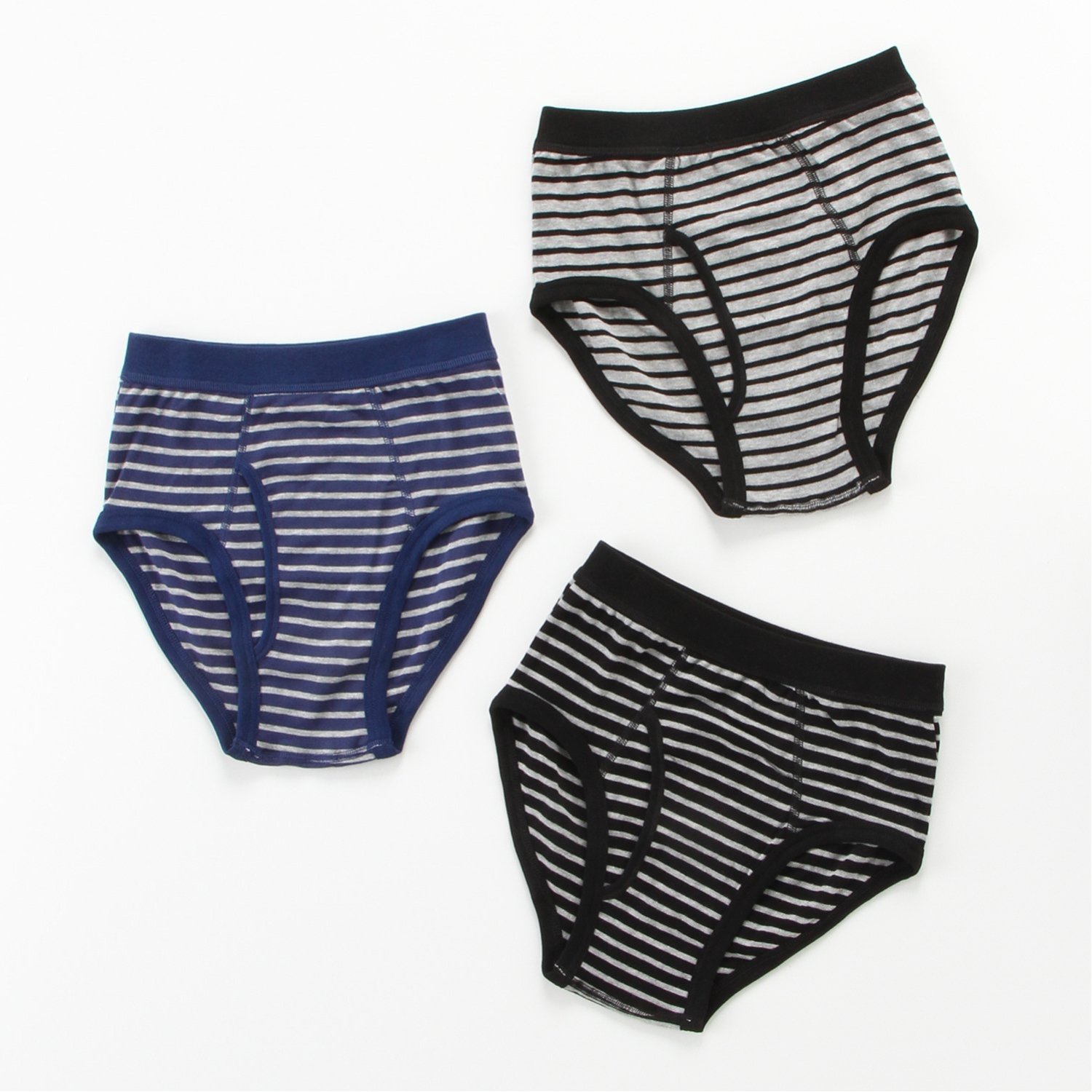 【おすすめのポイント】・男の子らしいクールなボーダー柄・内側には名前が記入できるネームタグ付き・洗い替えに便利なうれしい3枚セットなめらかな肌あたりの綿混素材が心地よい、前開きタイプのブリーフです。やわらかい生地を使用した伸縮性のある天スパン仕様で、ウエストにやさしくフィット。