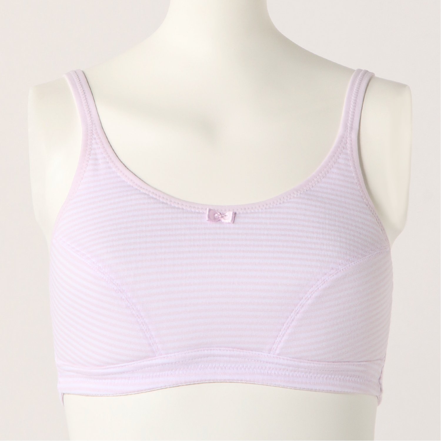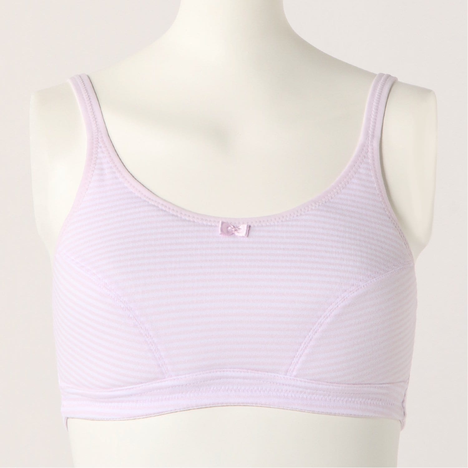 【おすすめのポイント】・サッと着脱しやすいかぶりタイプ・締め付け & 食い込みにくいノンワイヤー・アジャスター付きの肩ひもは長さの調節が可能カジュアルなボーダー柄に愛らしいリボンをあしらったノンワイヤーブラ。カップ裏打ちに伸縮性のあるメッシュウレタン素材を使用し、やさしくフィットします。小学生や中学生におすすめです。