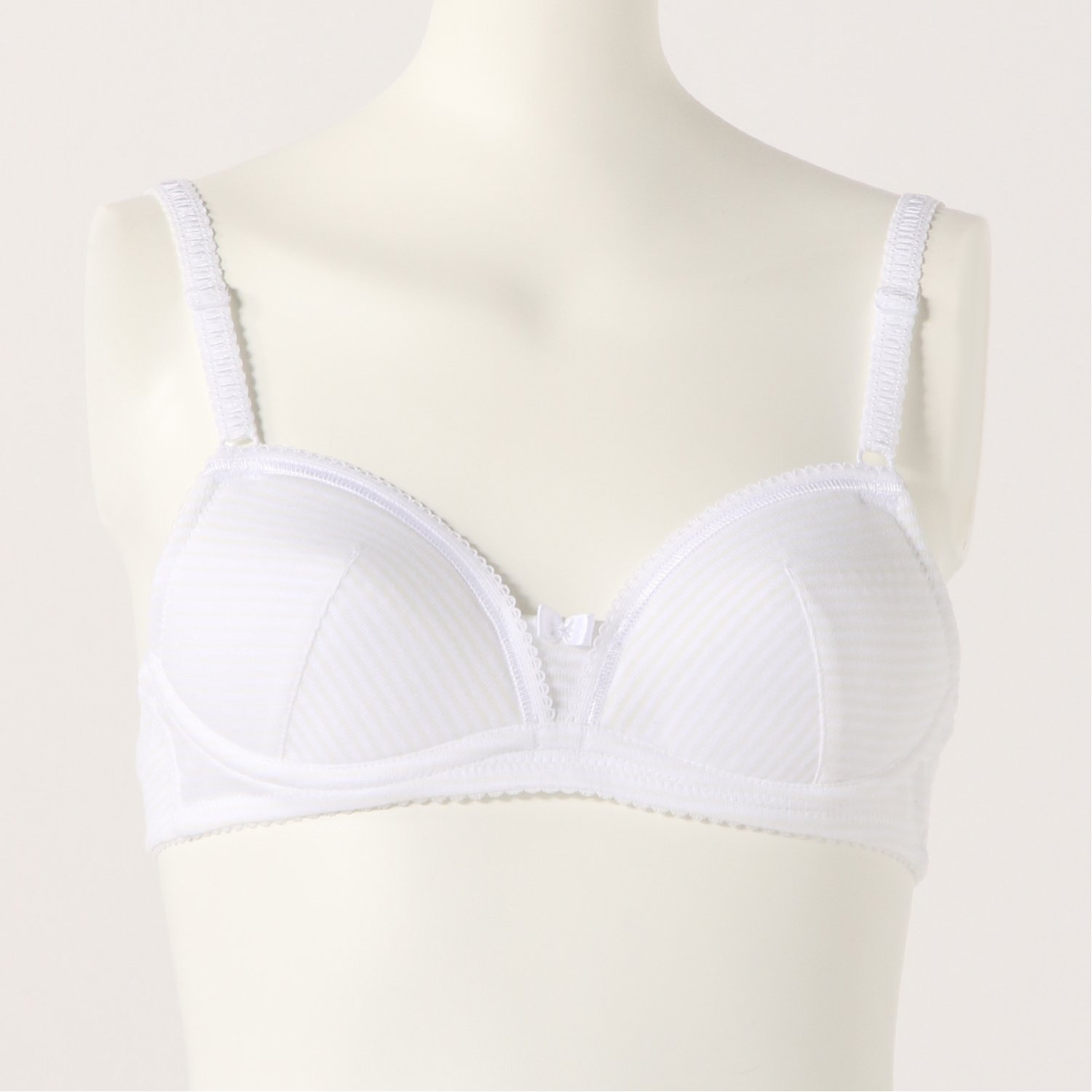 【おすすめポイント】・縁に沿ってピコレースを配した愛らしいデザイン・身生地には柔らかな風合いの綿混素材を使用・成長期のバストをきちんと支えるワイヤー入り爽やかなボーダー柄のワイヤー入りブラです。フロントに施したリボンモチーフが愛らしいアクセントに。シンプルなデザインでスクールインナーとして活躍します。