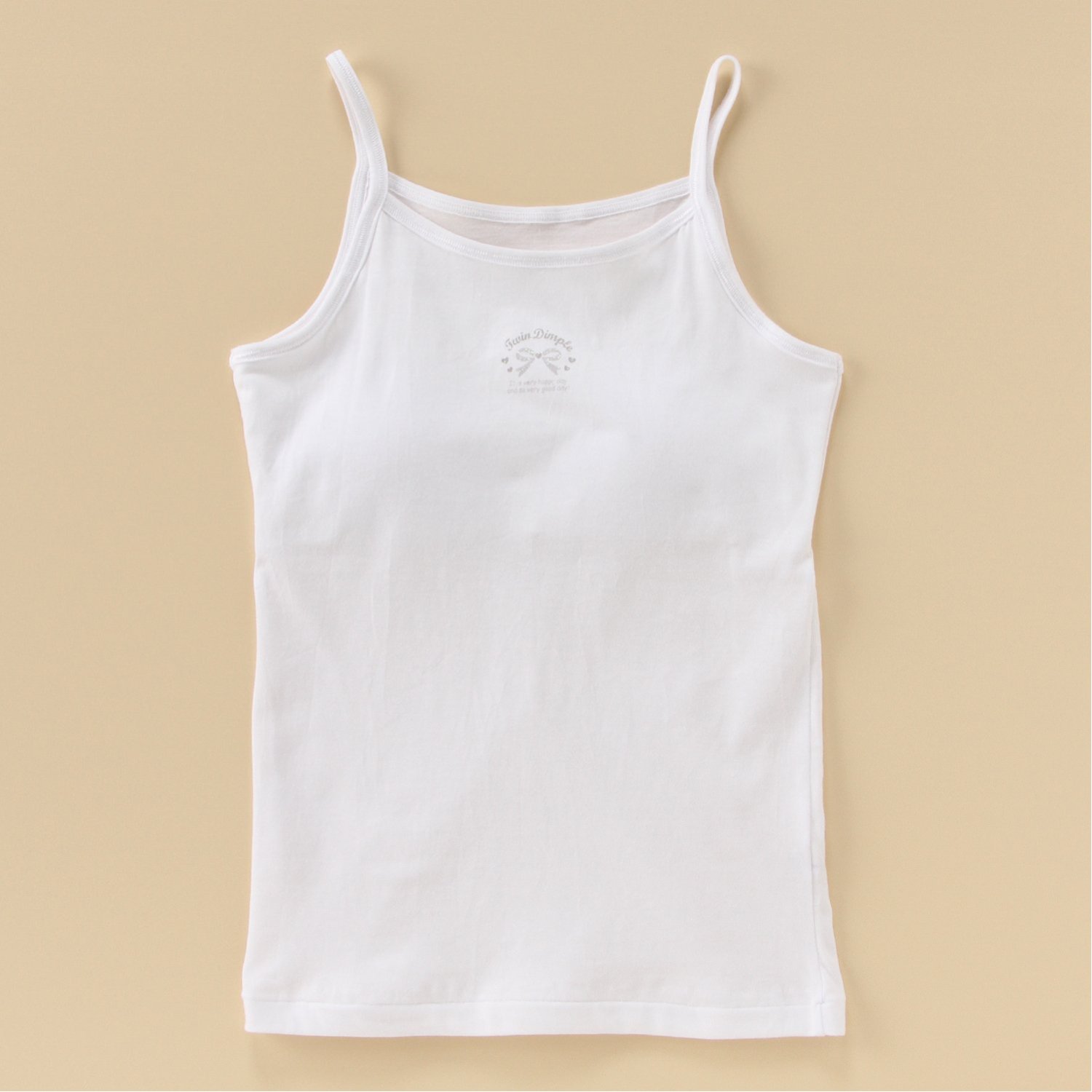 【こだわりのポイント】・成長期のバストをふんわり包むカップ付き・パイピングでよれにくい、襟ぐりとアームホール・お肌にやさしい綿100%素材を採用胸元にリボンのラメプリントをあしらった日本製キャミソールです。バストの成長に合わせて入れ替えができるカップ付き。薄手の素材を採用し、ロングシーズン活躍するアイテムです。